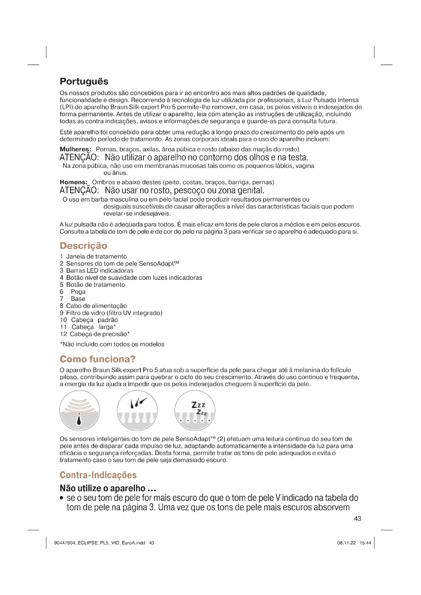 se o seu tom de pele for mais escuro do que o tom de pele V indicado na tabela do tom de pele na página 3. Uma vez que os tons de pele mais escuros absorvem 90447904_ECLIPSE_PL5_VIO_EuroA.indd 4390447904_ECLIPSE_PL5_VIO_EuroA.indd 43 08.11.22 15:4408.11.22 15:4444 mais luz, o tratamento de um tom de pele muito escuro pode causar desconforto/ dor e efeitos adversos (tais como queimaduras, bolhas, descolorações ou cicatrizes) e provocar lesões na sua pele.