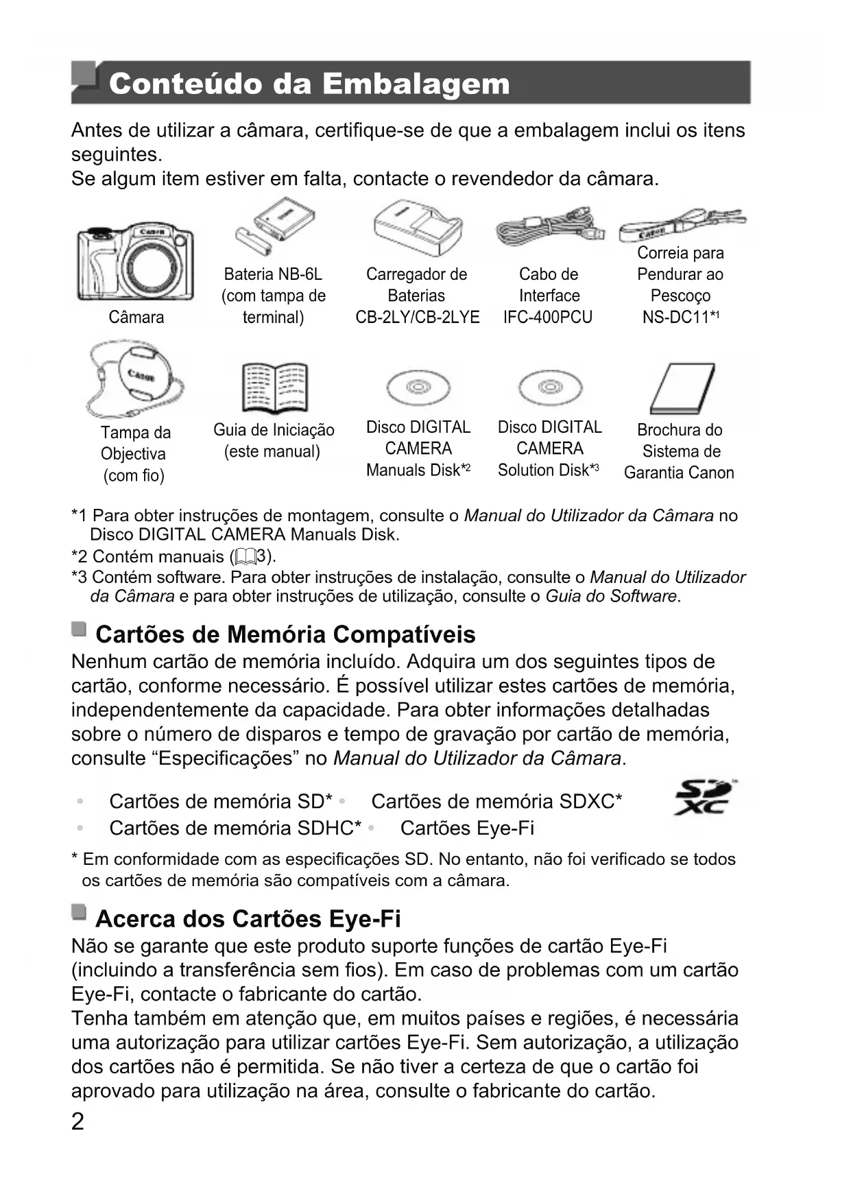 Brochura do Sistema de Garantia Canon *1 Para obter instruções de montagem, consulte o Manual do Utilizador da Câmara no Disco DIGITAL CAMERA Manuals Disk. *2 Contém manuais (= 3). *3 Contém software. Para obter instruções de instalação, consulte o Manual do Utilizador da Câmara e para obter instruções de utilização, consulte o Guia do Software. Cartões de Memória Compatíveis Nenhum cartão de memória incluído. Adquira um dos seguintes tipos de cartão, conforme necessário. É possível utilizar estes cartões de memória, independentemente da capacidade. Para obter informações detalhadas sobre o número de disparos e tempo de gravação por cartão de memória, consulte “Especicações” no Manual do Utilizador da Câmara.