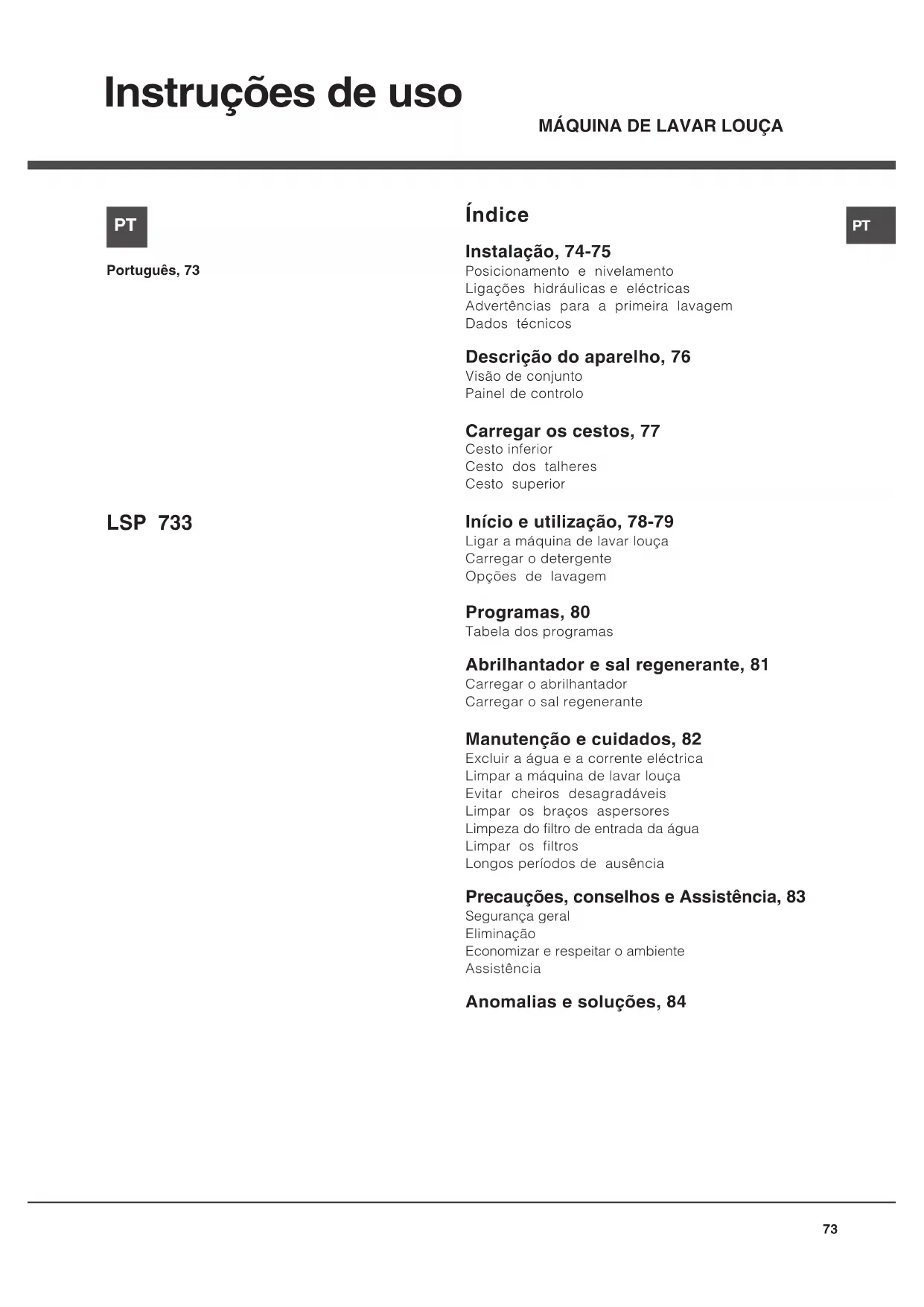 Instruções de uso Índice Instalação, 74-75 Posicionamento e nivelamento Ligações hidráulicas e eléctricas Advertências para a primeira lavagem Dados técnicos Descrição do aparelho, 76 Visão de conjunto Painel de controlo Carregar os cestos, 77 Cesto inferior Cesto dos talheres Cesto superior Início e utilização, 78-79 Ligar a máquina de lavar louça Carregar o detergente Opções de lavagem Programas, 80 Tabela dos programas Abrilhantador e sal regenerante, 81 Carregar o abrilhantador Carregar o sal regenerante Manutenção e cuidados, 82 Excluir a água e a corrente eléctrica Limpar a máquina de lavar louça Evitar cheiros desagradáveis Limpar os braços aspersores Limpeza do filtro de entrada da água Limpar os filtros Longos períodos de ausência Precauções, conselhos e Assistência, 83 Segurança geral Eliminação Economizar e respeitar o ambiente Assistência Anomalias e soluções, 84 Português, 73
