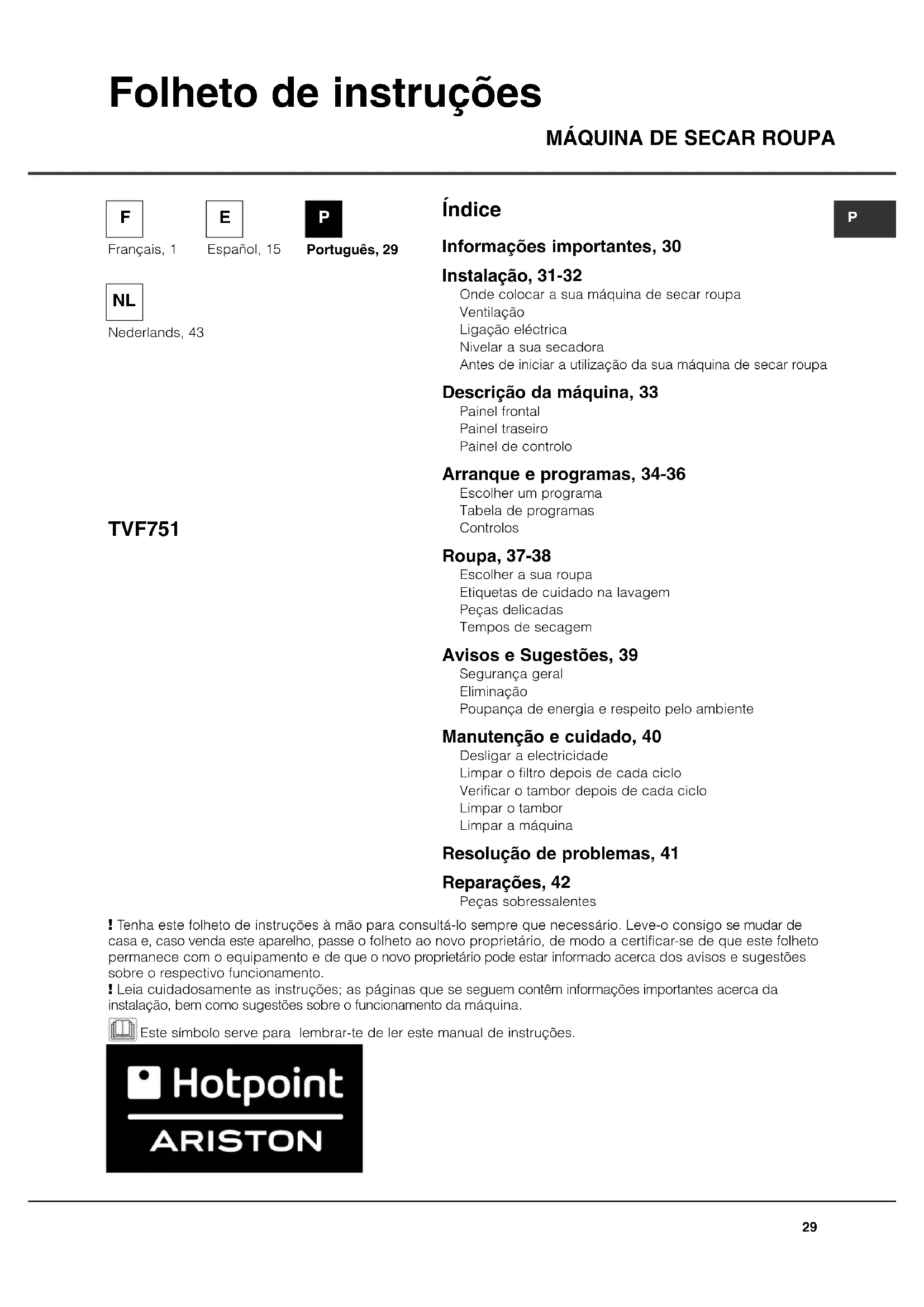 TVF751 Folheto de instruções Informações importantes, 30 Instalação, 31-32 Onde colocar a sua máquina de secar roupa Ventilação Ligação eléctrica Nivelar a sua secadora Antes de iniciar a utilização da sua máquina de secar roupa Descrição da máquina, 33 Painel frontal Painel traseiro Painel de controlo Arranque e programas, 34-36 Escolher um programa Tabela de programas Controlos Roupa, 37-38 Escolher a sua roupa Etiquetas de cuidado na lavagem Peças delicadas Tempos de secagem Avisos e Sugestões, 39 Segurança geral Eliminação Poupança de energia e respeito pelo ambiente Manutenção e cuidado, 40 Desligar a electricidade Limpar o filtro depois de cada ciclo Verificar o tambor depois de cada ciclo Limpar o tambor Limpar a máquina Resolução de problemas, 41 Reparações, 42 Peças sobressalentes