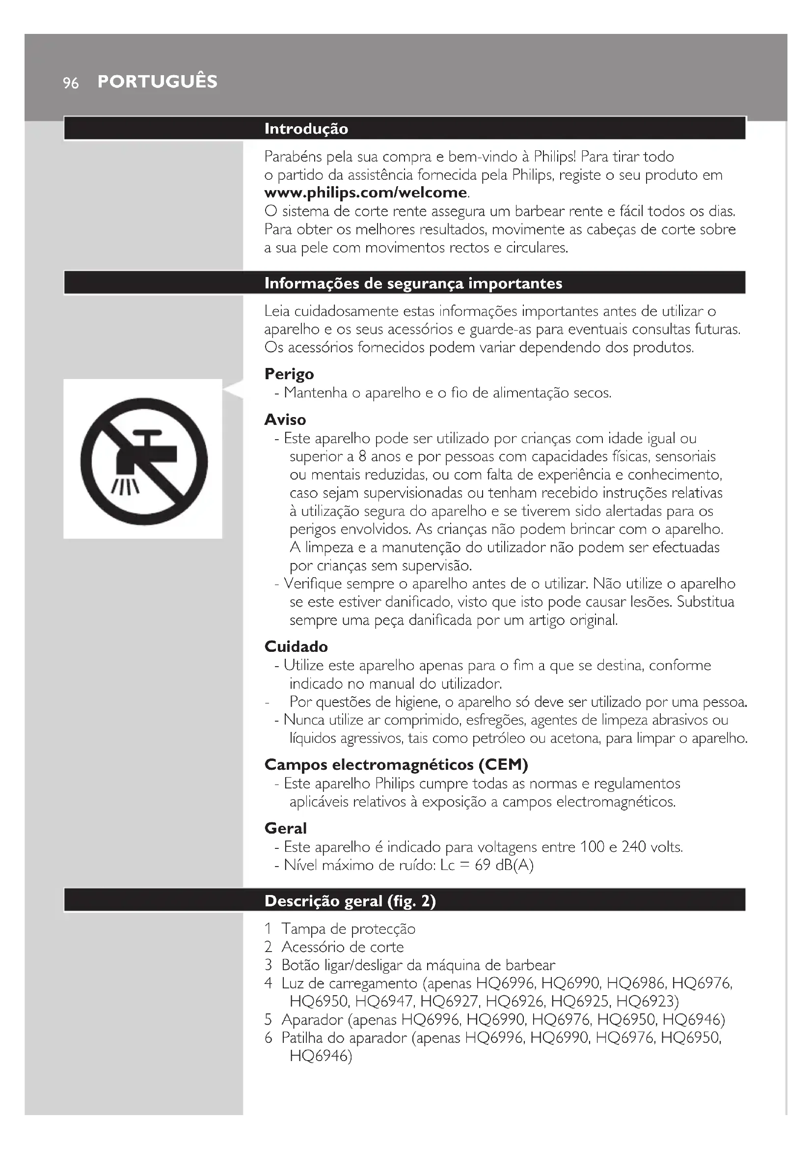 Por questões de higiene, o aparelho só deve ser utilizado por uma pessoa. - Nunca utilize ar comprimido, esfregões, agentes de limpeza abrasivos ou líquidos agressivos, tais como petróleo ou acetona, para limpar o aparelho. Campos electromagnéticos (CEM) - Este aparelho Philips cumpre todas as normas e regulamentos aplicáveis relativos à exposição a campos electromagnéticos. Geral - Este aparelho é indicado para voltagens entre 100 e 240 volts. - Nível máximo de ruído: Lc = 69 dB(A) Descrição geral (g. 2) 1 Tampa de protecção 2 Acessório de corte 3 Botão ligar/desligar da máquina de barbear 4 Luz de carregamento (apenas HQ6996, HQ6990, HQ6986, HQ6976, HQ6950, HQ6947, HQ6927, HQ6926, HQ6925, HQ6923) 5 Aparador (apenas HQ6996, HQ6990, HQ6976, HQ6950, HQ6946) 6 Patilha do aparador (apenas HQ6996, HQ6990, HQ6976, HQ6950, HQ6946) PORTUGUÊS7 Escova de limpeza 8 Cabo de alimentação com cha 9 Ficha do aparelho Carregamento Carregue o aparelho: - antes da primeira utilização e quando não o utiliza durante um período prolongado - quando o motor pára ou a sua velocidade é reduzida Ao carregar a máquina de barbear pela primeira vez e depois de não a usar durante um período prolongado, melhore a capacidade da bateria da seguinte forma: 1 Carregue totalmente a máquina de barbear e use-a como habitualmente até descarregar totalmente a bateria. Repita este processo mais duas vezes. Se melhorar a capacidade da bateria desta forma, também pode carregar a máquina de barbear entre períodos de utilização, mesmo que a bateria ainda não esteja totalmente descarregada. Carrega a máquina de barbear (apenas HQ6996, HQ6990, HQ6986, HQ6976, HQ6950, HQ6947, HQ6927, HQ6926, HQ6925, HQ6923) Carga rápida (apenas HQ6996, HQ6990, HQ6986) Depois da máquina de barbear ter sido carregada durante 3 minutos, esta contém energia suciente para se barbear uma vez com a máquina desligada da alimentação. Carregar com o adaptador 1 Introduzaachadoaparelhonamáquinadebarbear. 2 Introduzaachadealimentaçãonatomadaeléctrica. Nota: Certique-se de que a máquina está desligada. , A luz de carga acende-se. , HQ6996, HQ6990, HQ6986: Carregue a máquina de barbear durante, no mínimo, 1 hora, mas sem ultrapassar as 24 horas. Quando a bateria estiver totalmente carregada, a luz de carga ca intermitente. , HQ6976, HQ6950, HQ6947, HQ6927, HQ6926, HQ6925, HQ6923: Carregue a máquina de barbear durante, no mínimo, 8 horas, mas sem ultrapassar as 24 horas. A luz de carga permanece continuamente acesa enquanto o aparelho estiver ligado à corrente eléctrica. Nota: Não deixe a máquina de barbear ligada permanentemente à corrente. Nota: Pode igualmente barbear-se sem carregar, bastando para tal ligar a máquina de barbear à corrente. 3 Retireachadatomadaeléctricaeretireachadoaparelhoda máquina de barbear quando a bateria estiver totalmente carregada. PORTUGUÊS 97Utilizar o aparelho Apenas HQ6996, HQ6990, HQ6986, HQ6976, HQ6950, HQ6947, HQ6927, HQ6926, HQ6925, HQ6923: pode utilizar a máquina de barbear ligada directamente à corrente eléctrica, mas também a pode usar sem os. Apenas HQ6946, HQ6906, HQ6902: pode utilizar a máquina de barbear apenas directamente ligada à corrente eléctrica. Preparar para a utilização (apenas HQ6946, HQ6906, HQ6902) 1 Introduzaachadoaparelhonamáquinadebarbear. 2 Introduzaachadealimentaçãonatomadaeléctrica. Corte 1 Empurre o botão ligar/desligar para cima para ligar a máquina. 2 Passe as cabeças de corte sobre a pele, efectuando movimentos circulares. Obterá melhores resultados se a pele estiver seca. A sua pele poderá precisar de 2 a 3 semanas para se adaptar ao sistema de barbear Philips. 3 Empurre o botão de ligar/desligar para baixo de modo a desligar o aparelho. 4 Sempre que se servir da máquina de barbear coloque-lhe a tampa de protecção para evitar qualquer dano. Aparar (apenas HQ6996, HQ6990, HQ6976, HQ6950, HQ6946) Pode utilizar o aparador para aparar as patilhas e o bigode. 1 Desloque a patilha do aparador para cima para abrir o aparador. O aparador pode ser activado com o motor em funcionamento. Limpeza e manutenção Uma limpeza regular garante melhores resultados de barbear. Este aparelho não é lavável. Não o mergulhe em água nem o lave com água corrente. PORTUGUÊS98Nunca utilize esfregões, agentes de limpeza abrasivos ou líquidos agressivos, tais como petróleo ou acetona, para limpar o aparelho. - Para uma limpeza fácil e perfeita, encontra-se disponível o Produto de Limpeza de Cabeças de Corte Philips (tipo HQ110). Obtenha mais informações junto do seu revendedor Philips. Nota: O Produto de Limpeza de Cabeças de Corte Philips pode não estar disponível em todos os países. Contacte o Centro de Assistência ao Cliente do seu país para obter informações acerca da disponibilidade deste acessório. Também pode limpar a máquina de barbear da seguinte forma: Semanalmente: acessório de corte e câmara de recolha dos pêlos 1 Desligueamáquinadebarbear,retireachadealimentaçãoda tomadaeléctricaeretireachadoaparelhodamáquina. 2 Limpe primeiro a parte superior do aparelho com a escova fornecida. 3 Pressione o botão de libertação (1) e retire o acessório de corte (2). 4 Limpe o interior do acessório de corte e a câmara de recolha dos pêlos com a escova. 5 Volte a colocar o acessório de corte na máquina de barbear.