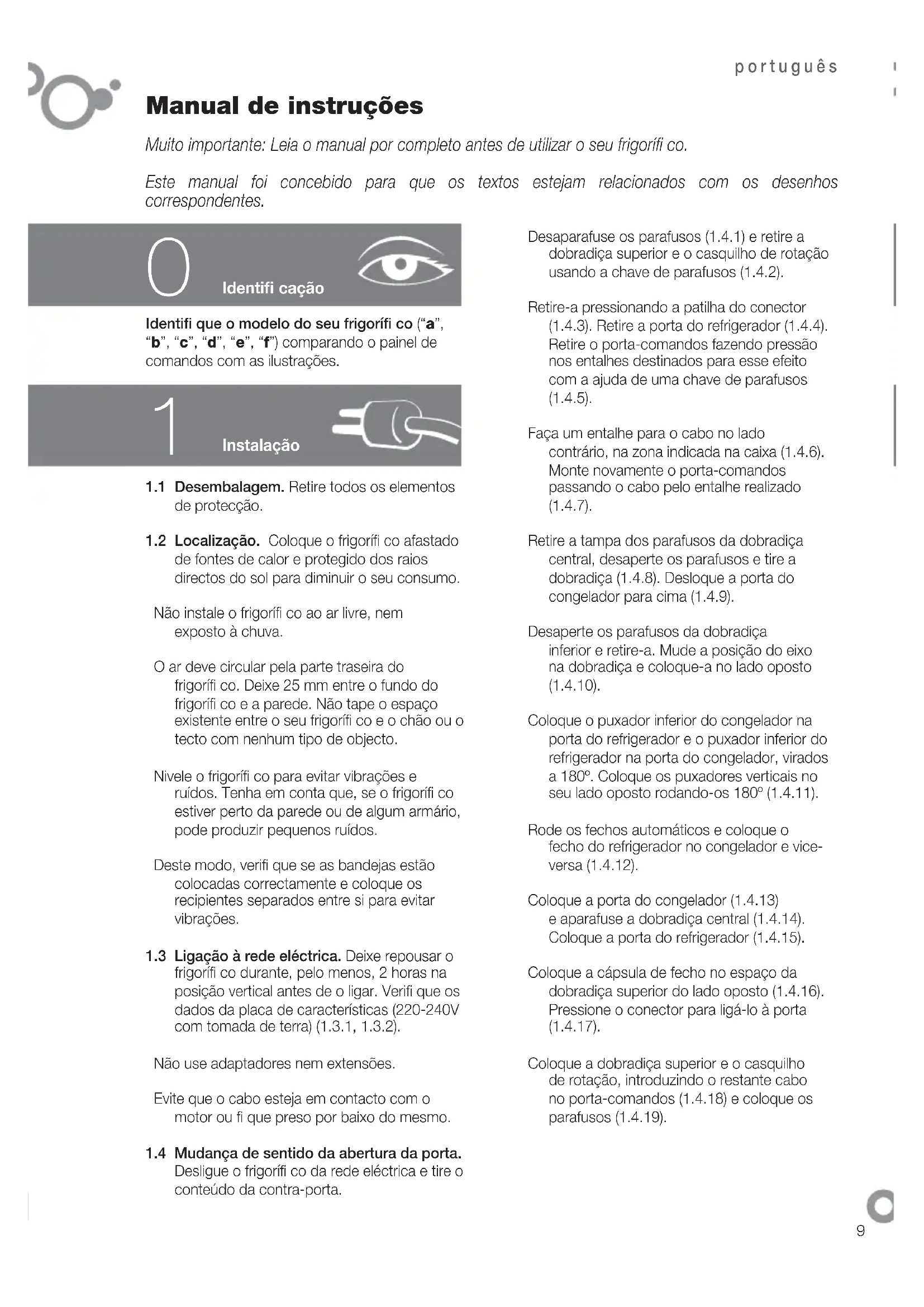 Manual de instruções Muito importante: Leia o manual por completo antes de utilizar o seu frigorífi co. Este manual foi concebido para que os textos estejam relacionados com os desenhos correspondentes. Instalação Identifi que o modelo do seu frigorífi co (“a”, “b”, “c”, “d”, “e”, “f”) comparando o painel de comandos com as ilustrações.