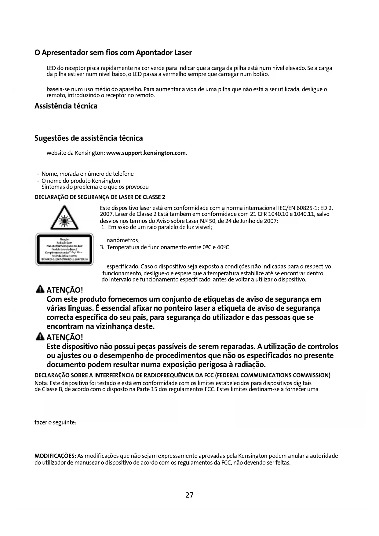 MODIFICAÇÕES: As modificações que não sejam expressamente aprovadas pela Kensington podem anular a autoridade do utilizador de manusear o dispositivo de acordo com os regulamentos da FCC, não devendo ser feitas.
