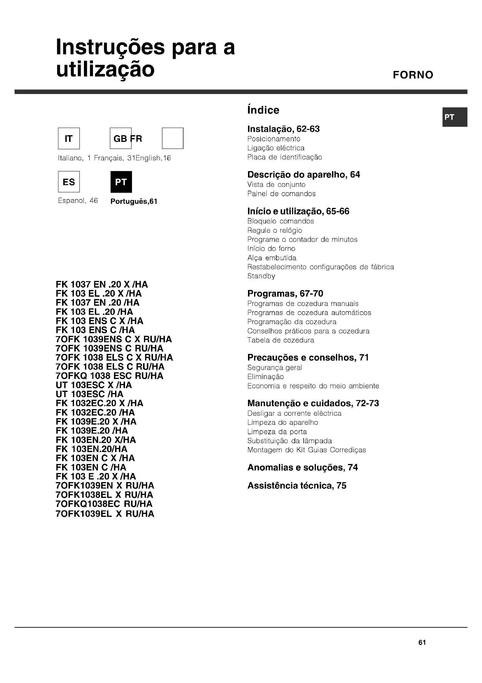 Índice Instalação, 62-63 Posicionamento Ligação eléctrica Placa de identificação Descrição do aparelho, 64 Vista de conjunto Painel de comandos Início e utilização, 65-66 Bloqueio comandos Regule o relógio Programe o contador de minutos Início do forno Alça embutida Restabelecimento configurações de fábrica Standby Programas, 67-70 Programas de cozedura manuais Programas de cozedura automáticos Programação da cozedura Conselhos práticos para a cozedura Tabela de cozedura Precauções e conselhos, 71 Segurança geral Eliminação Economia e respeito do meio ambiente Manutenção e cuidados, 72-73 Desligar a corrente eléctrica Limpeza do aparelho Limpeza da porta Substituição da lâmpada Montagem do Kit Guias Corrediças Anomalias e soluções, 74 Assistência técnica, 75 Instruções para a utilização Português,61