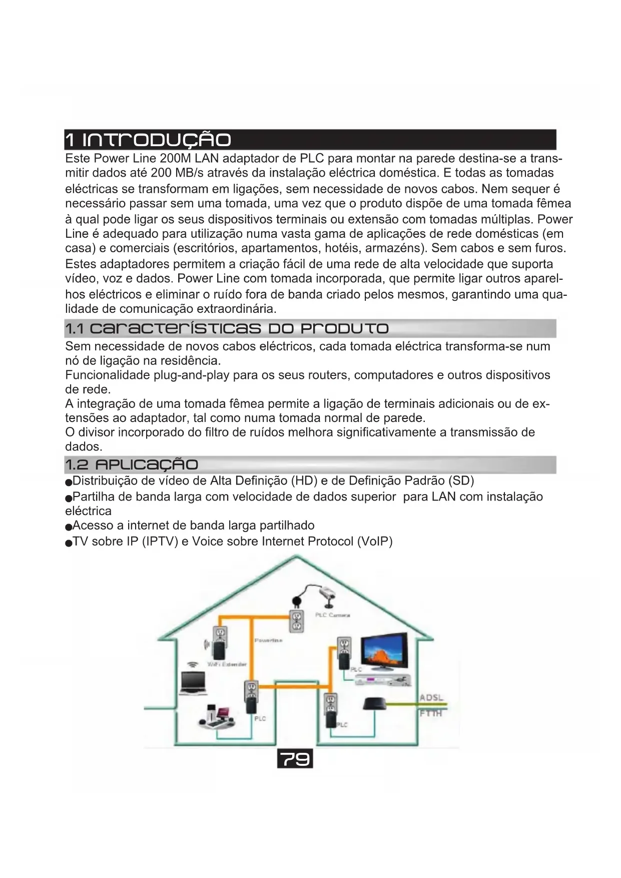 Este Power Line 200M LAN adaptador de PLC para montar na parede destina-se a trans- mitir dados até 200 MB/s através da instalação eléctrica doméstica. E todas as tomadas eléctricas se transformam em ligações, sem necessidade de novos cabos. Nem sequer é necessário passar sem uma tomada, uma vez que o produto dispõe de uma tomada fêmea à qual pode ligar os seus dispositivos terminais ou extensão com tomadas múltiplas. Power Line é adequado para utilização numa vasta gama de aplicações de rede domésticas (em casa) e comerciais (escritórios, apartamentos, hotéis, armazéns). Sem cabos e sem furos. Estes adaptadores permitem a criação fácil de uma rede de alta velocidade que suporta vídeo, voz e dados. Power Line com tomada incorporada, que permite ligar outros aparel- hos eléctricos e eliminar o ruído fora de banda criado pelos mesmos, garantindo uma qua- lidade de comunicação extraordinária. Sem necessidade de novos cabos eléctricos, cada tomada eléctrica transforma-se num nó de ligação na residência. Funcionalidade plug-and-play para os seus routers, computadores e outros dispositivos de rede. A integração de uma tomada fêmea permite a ligação de terminais adicionais ou de ex- tensões ao adaptador, tal como numa tomada normal de parede. O divisor incorporado do filtro de ruídos melhora significativamente a transmissão de dados. n Distribuição de vídeo de Alta Definição (HD) e de Definição Padrão (SD) n Partilha de banda larga com velocidade de dados superior para LAN com instalação eléctrica n Acesso a internet de banda larga partilhado n TV sobre IP (IPTV) e Voice sobre Internet Protocol (VoIP)80 2 Aviso de segurança: