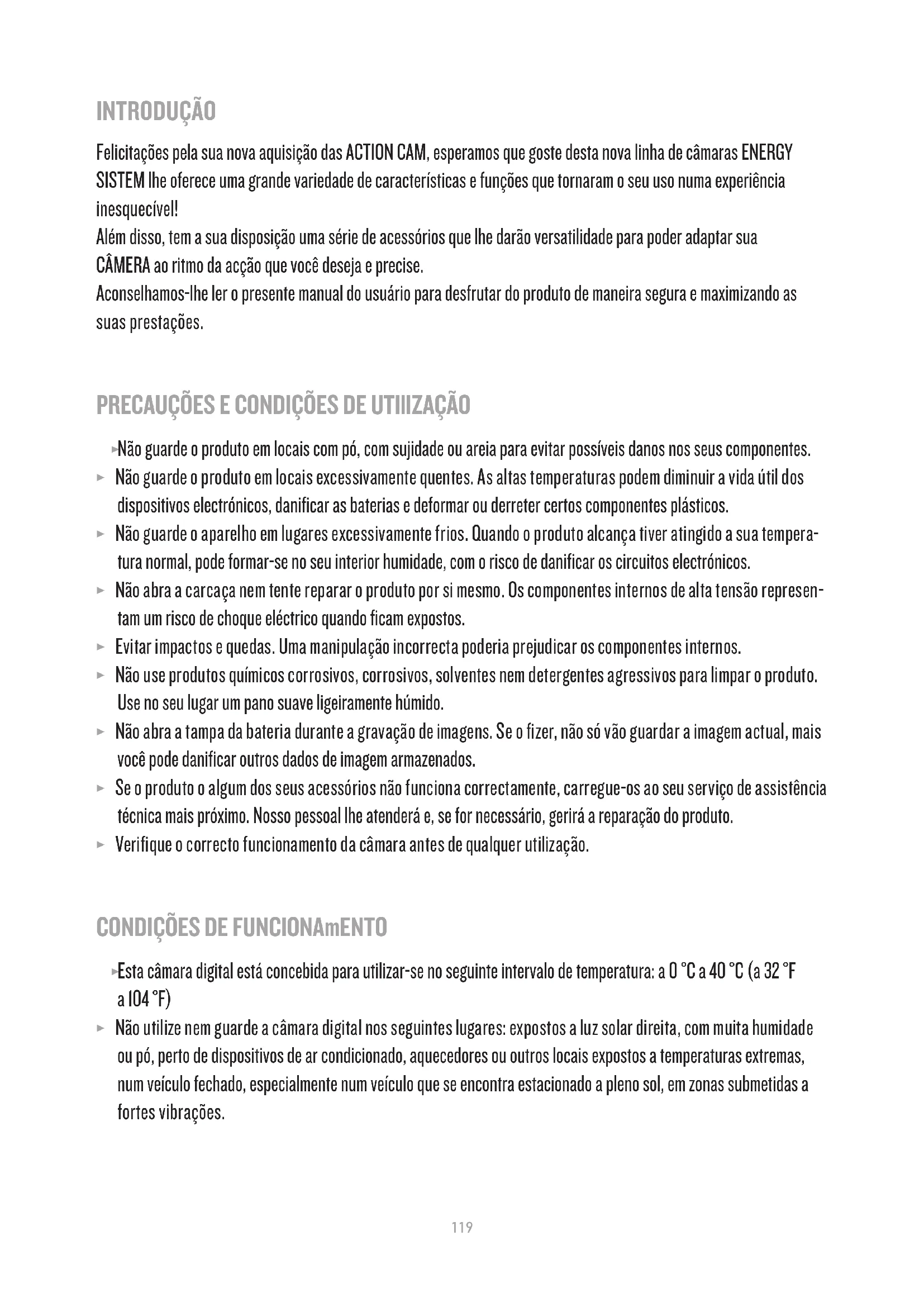 Nombre del suministrador / Manufacturer Name / Nom du Fournisseur / Nome do Fabricante: Energy Sistem Soyntec S.A. Dirección / Address / Adresse / Endereço: Pol. Ind. Finestrat C/. Calpe, 1 - 03509 Finestrat Alicante (España) Tel: 902 388 388 (España) Fax: 902 119 034 (España) NIF: A53107488 Declaramos bajo nuestra exclusiva responsabilidad la conformidad del producto: / We declare, under our own exclusive responsibility, that the product: / Declarons sous notre seule responsabilité que le produit: /Declaramos, sob nossa exclusiva responsabilidade, que o produto: Energy Sistem™ Energy Sport Cam Extreme - Energy Sport Cam Pro País de fabricación /Manufacturing country /Pays de fabrication / País de fabricação: China / China / Chine / China Al que se refiere esta declaración, con las normas u otros documentos normativos de acuerdo con las disposiciones de la Directiva 99/05/CE del Parlamento Europeo y del Consejo de 9 de marzo de 1999, traspuesta a la legislación española mediante el Real Decreto 1890/2000, de 20 de Noviembre. / Is in compliance with the essential norms and standards of the Directive 1999/5/ EC of the European Parliament and of the Council of March 09th 1999. / Auquel se réfère cette déclaration, est conforme aux normes ou documents normatifs de la Directive 1999/5/EC du Parlement Européen et du Conseil du 09 mars 1999. / Está em conformidade com as normas e padrões essenciais da Diretiva 1999/5/EC do Parlamento Europeu e do Conselho de 09 de março de 1999. 26/11/2013117 Manual do usuário119119 INTRODUÇÃO Felicitações pela sua nova aquisição das ACTION CAM, esperamos que goste desta nova linha de câmaras ENERGY SISTEM lhe oferece uma grande variedade de características e funções que tornaram o seu uso numa experiência inesquecível! Além disso, tem a sua disposição uma série de acessórios que lhe darão versatilidade para poder adaptar sua CÂMERA ao ritmo da acção que você deseja e precise. Aconselhamos-lhe ler o presente manual do usuário para desfrutar do produto de maneira segura e maximizando as suas prestações. PRECAUÇÕES E CONDIÇÕES DE UTIlIzAÇÃO