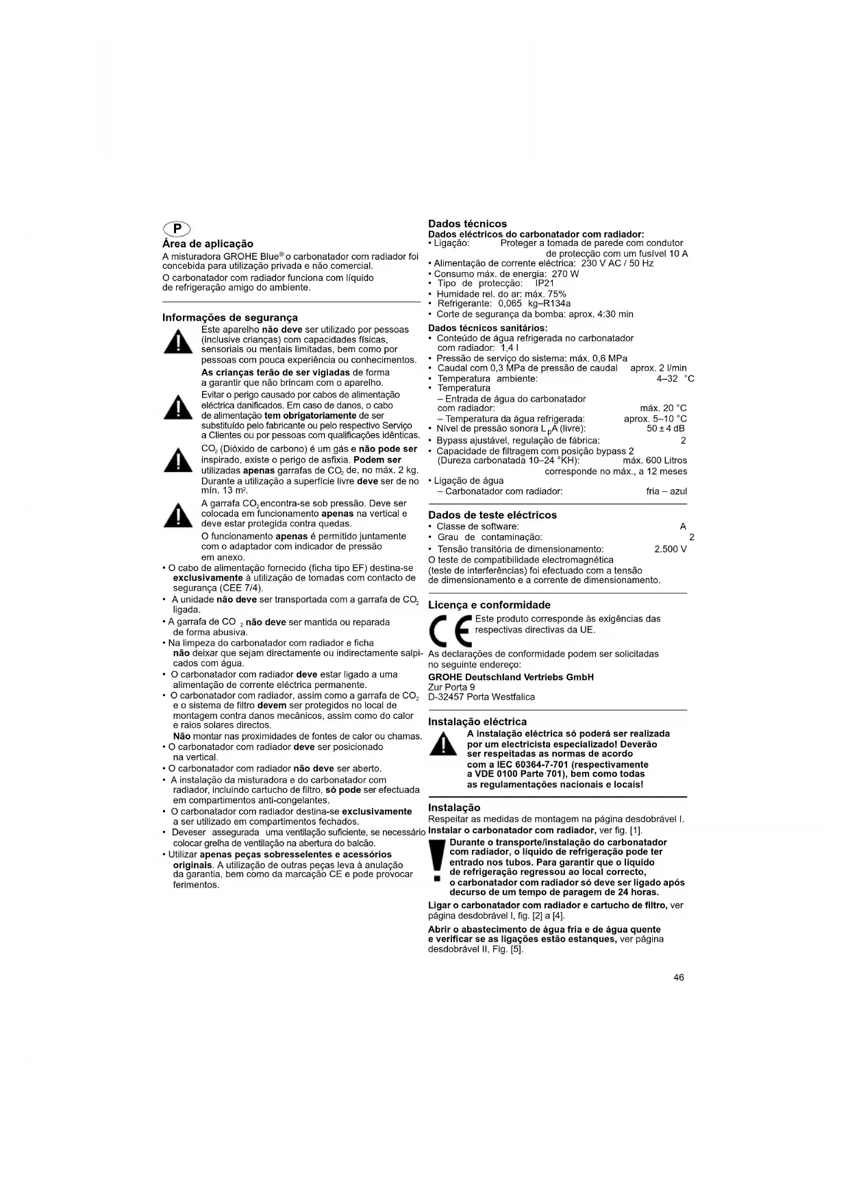 - Tensão transitória de dimensionamento: 2.500 V O teste de compatibilidade electromagnética (teste de interferências) foi efectuado com a tensão de dimensionamento e a corrente de dimensionamento. Licença e conformidade As declarações de conformidade podem ser solicitadas no seguinte endereço: GROHE Deutschland Vertriebs GmbH Zur Porta 9 D-32457 Porta Westfalica Instalação eléctrica A instalação eléctrica só poderá ser realizada por um electricista especializado! Deverão ser respeitadas as normas de acordo com a IEC 60364-7-701 (respectivamente a VDE 0100 Parte 701), bem como todas as regulamentações nacionais e locais! Instalação Respeitar as medidas de montagem na página desdobrável I. Instalar o carbonatador com radiador, ver fig. [1]. Durante o transporte/instalação do carbonatador com radiador, o líquido de refrigeração pode ter entrado nos tubos. Para garantir que o líquido de refrigeração regressou ao local correcto, o carbonatador com radiador só deve ser ligado após decurso de um tempo de paragem de 24 horas. Ligar o carbonatador com radiador e cartucho de filtro, ver página desdobrável I, fig. [2] a [4]. Abrir o abastecimento de água fria e de água quente e verificar se as ligações estão estanques, ver página desdobrável II, Fig. [5]. Este produto corresponde às exigências das respectivas directivas da UE.47 Estabelecer a ligação de ficha entre a misturadora e o carbonatador com radiador, ver fig. [6]. Estabelecer a alimentação de corrente eléctrica através do cabo de alimentação, ver fig. [7]. A indicação no ecrã acende-se e é apresentada a capacidade restante do filtro em percentagem. Ligar a garrafa CO