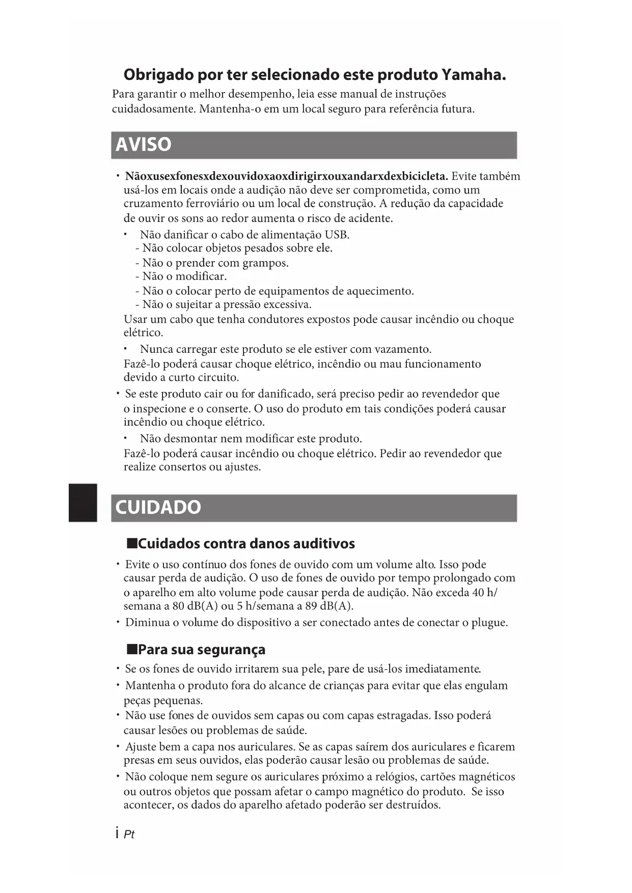 Obrigado por ter selecionado este produto Yamaha. Para garantir o melhor desempenho, leia esse manual de instruções cuidadosamente. Mantenha-o em um local seguro para referência futura. AVISO x Nãoxusexfonesxdexouvidoxaoxdirigirxouxandarxdexbicicleta. Evite também usá-los em locais onde a audição não deve ser comprometida, como um cruzamento ferroviário ou um local de construção. A redução da capacidade de ouvir os sons ao redor aumenta o risco de acidente. x Não danificar o cabo de alimentação USB. - Não colocar objetos pesados sobre ele. - Não o prender com grampos. - Não o modificar. - Não o colocar perto de equipamentos de aquecimento. - Não o sujeitar a pressão excessiva. Usar um cabo que tenha condutores expostos pode causar incêndio ou choque elétrico. x Nunca carregar este produto se ele estiver com vazamento. Fazê-lo poderá causar choque elétrico, incêndio ou mau funcionamento devido a curto circuito. x Se este produto cair ou for danificado, será preciso pedir ao revendedor que o inspecione e o conserte. O uso do produto em tais condições poderá causar incêndio ou choque elétrico. x Não desmontar nem modificar este produto. Fazê-lo poderá causar incêndio ou choque elétrico. Pedir ao revendedor que realize consertos ou ajustes. CUIDADO ■ Cuidados contra danos auditivos x Evite o uso contínuo dos fones de ouvido com um volume alto. Isso pode causar perda de audição. O uso de fones de ouvido por tempo prolongado com o aparelho em alto volume pode causar perda de audição. Não exceda 40 h/ semana a 80 dB(A) ou 5 h/semana a 89dB(A). x Diminua o volume do dispositivo a ser conectado antes de conectar o plugue. ■ Para sua segurança x Se os fones de ouvido irritarem sua pele, pare de usá-los imediatamente. x Mantenha o produto fora do alcance de crianças para evitar que elas engulam peças pequenas. x Não use fones de ouvidos sem capas ou com capas estragadas. Isso poderá causar lesões ou problemas de saúde. x Ajuste bem a capa nos auriculares. Se as capas saírem dos auriculares e ficarem presas em seus ouvidos, elas poderão causar lesão ou problemas de saúde. x Não coloque nem segure os auriculares próximo a relógios, cartões magnéticos ou outros objetos que possam afetar o campo magnético do produto. Se isso acontecer, os dados do aparelho afetado poderão ser destruídos.ii