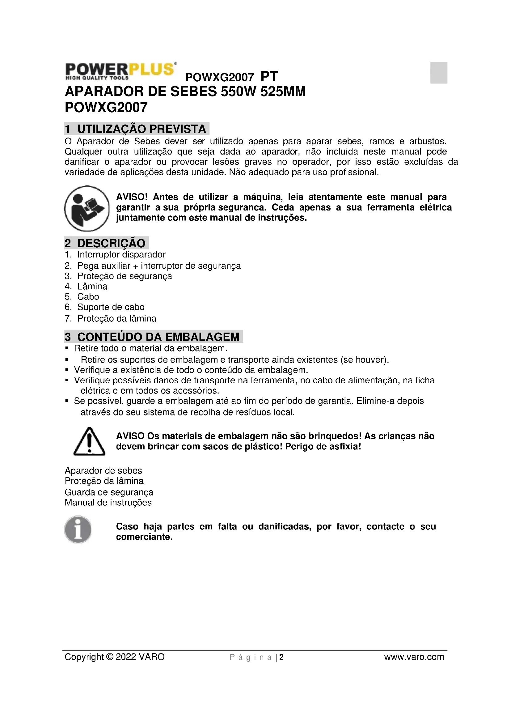 - Se possível, guarde a embalagem até ao fim do período de garantia. Elimine-a depois através do seu sistema de recolha de resíduos local. AVISO Os materiais de embalagem não são brinquedos! As crianças não devem brincar com sacos de plástico! Perigo de asfixia! Aparador de sebes Proteção da lâmina Guarda de segurança Manual de instruções Caso haja partes em falta ou danificadas, por favor, contacte o seu comerciante.POWXG2007 PT Copyright © 2022 VARO P á g i n a | 3 www.varo.com 4 SÍMBOLOS Neste manual e/ou na máquina são utilizados os seguintes símbolos: