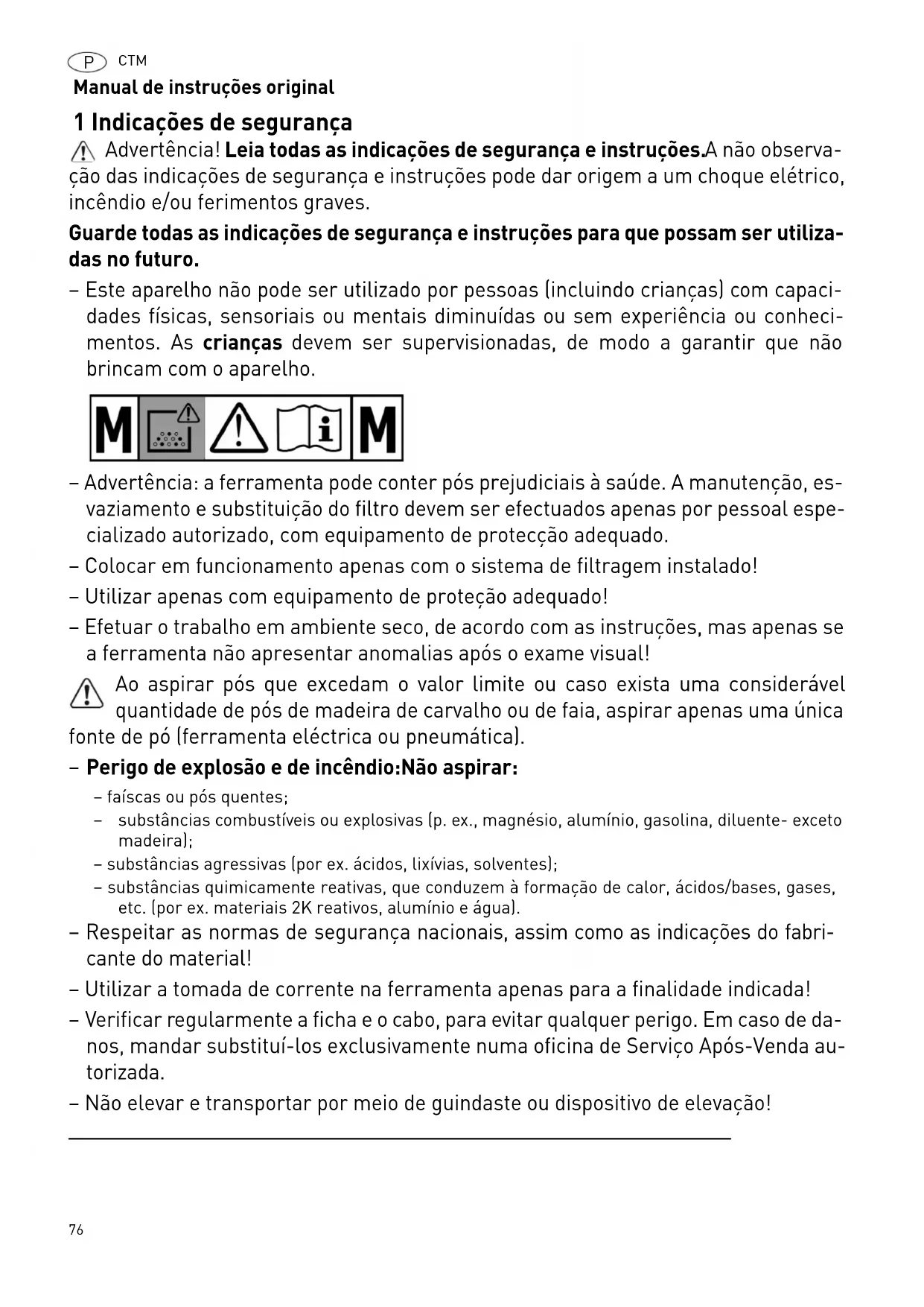 Perigo de explosão e de incêndio:Não aspirar: – faíscas ou pós quentes; – substâncias combustíveis ou explosivas (p. ex., magnésio, alumínio, gasolina, diluente- exceto madeira); – substâncias agressivas (por ex. ácidos, lixívias, solventes); – substâncias quimicamente reativas, que conduzem à formação de calor, ácidos/bases, gases, etc. (por ex. materiais 2K reativos, alumínio e água). – Respeitar as normas de segurança nacionais, assim como as indicações do fabri- cante do material! – Utilizar a tomada de corrente na ferramenta apenas para a finalidade indicada! – Verificar regularmente a ficha e o cabo, para evitar qualquer perigo. Em caso de da- nos, mandar substituí-los exclusivamente numa oficina de Serviço Após-Venda au- torizada. – Não elevar e transportar por meio de guindaste ou dispositivo de elevação!CTM