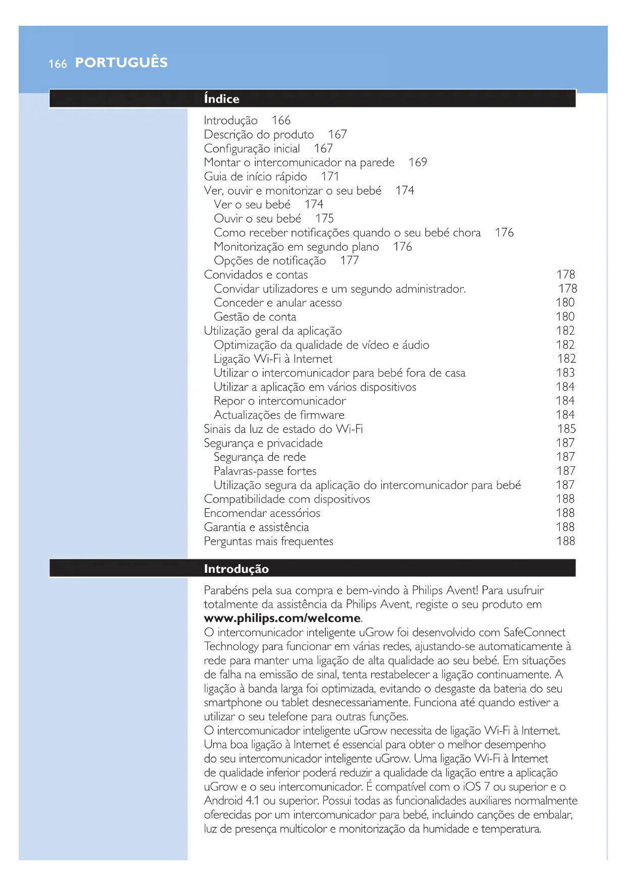 O intercomunicador inteligente uGrow necessita de ligação Wi-Fi à Internet. Uma boa ligação à Internet é essencial para obter o melhor desempenho do seu intercomunicador inteligente uGrow. Uma ligação Wi-Fi à Internet de qualidade inferior poderá reduzir a qualidade da ligação entre a aplicação uGrow e o seu intercomunicador. É compatível com o iOS 7 ou superior e o Android 4.1 ou superior. Possui todas as funcionalidades auxiliares normalmente oferecidas por um intercomunicador para bebé, incluindo canções de embalar, luz de presença multicolor e monitorização da humidade e temperatura.