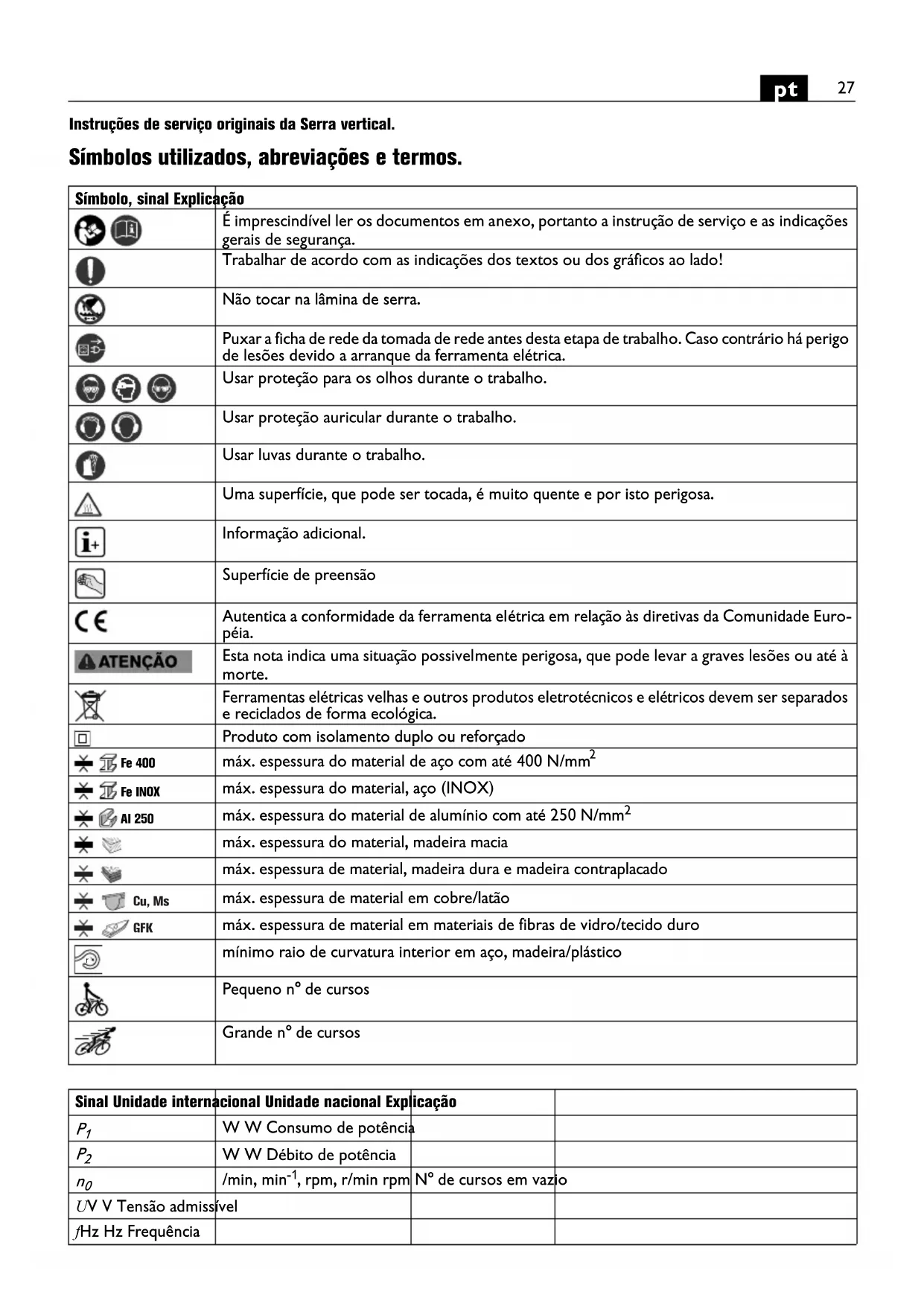 Manter as mãos afastadas da lâmina de serra. Não colocar as mãos na fronte nem atrás da lâmina de serra. Ocontacto com a lâmina de serra pode levar a lesões. A lâmina de serra pode tornar-se bem quente ao serrar.