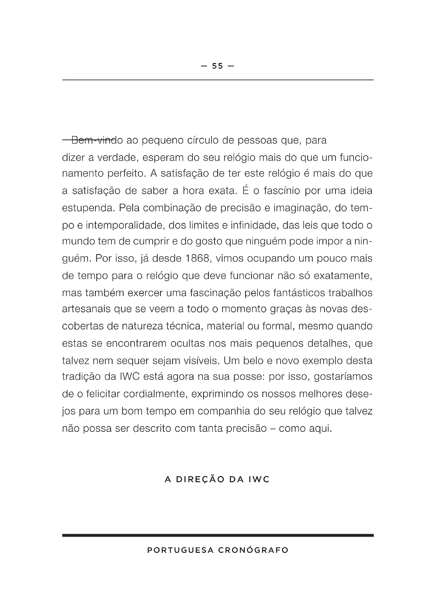 —Bem-vindo ao muito bom círculo de pessoas que, para fazer a Verdade, esperam do seu relógio mais do que um funcção perfeito. A satisfiação de ter este relógio é mais do que a satisfiação de saber a hora exata. É o fascínio por uma ideia estupenda. Pela combinação de precisão e imaginação, do tempo e intertemporalidade, dos limites e infinidade, das leis que todo o mundo tem de cumprir e do gosto que ninguém pode imporar a ninguém. Por isto, já desde 1868, vimosocupando um pouco mais de tempo para o relógio que deve Functionar não so exatamente, mas quando exercer uma fascinhação pelos fantásticos tratados artesanais que se veem a todo o momento gratas às novas descobertas de natureza técnica, material ou formal, mesmo quando estas se encontrar em ocultas nos mais preocupos detalhes, que talvez nem sequer sejam visíveis. Um belo e novo exemple desta tradicao da IwC está ahora na sua posse: por isto, gostariamos de o felicitar cordialmente, exprimindo os outros melhores发展目标 para um bom tempo em companhia do seu relógio que talvez não possa ser descririto com tanta precisão - comoquiry.