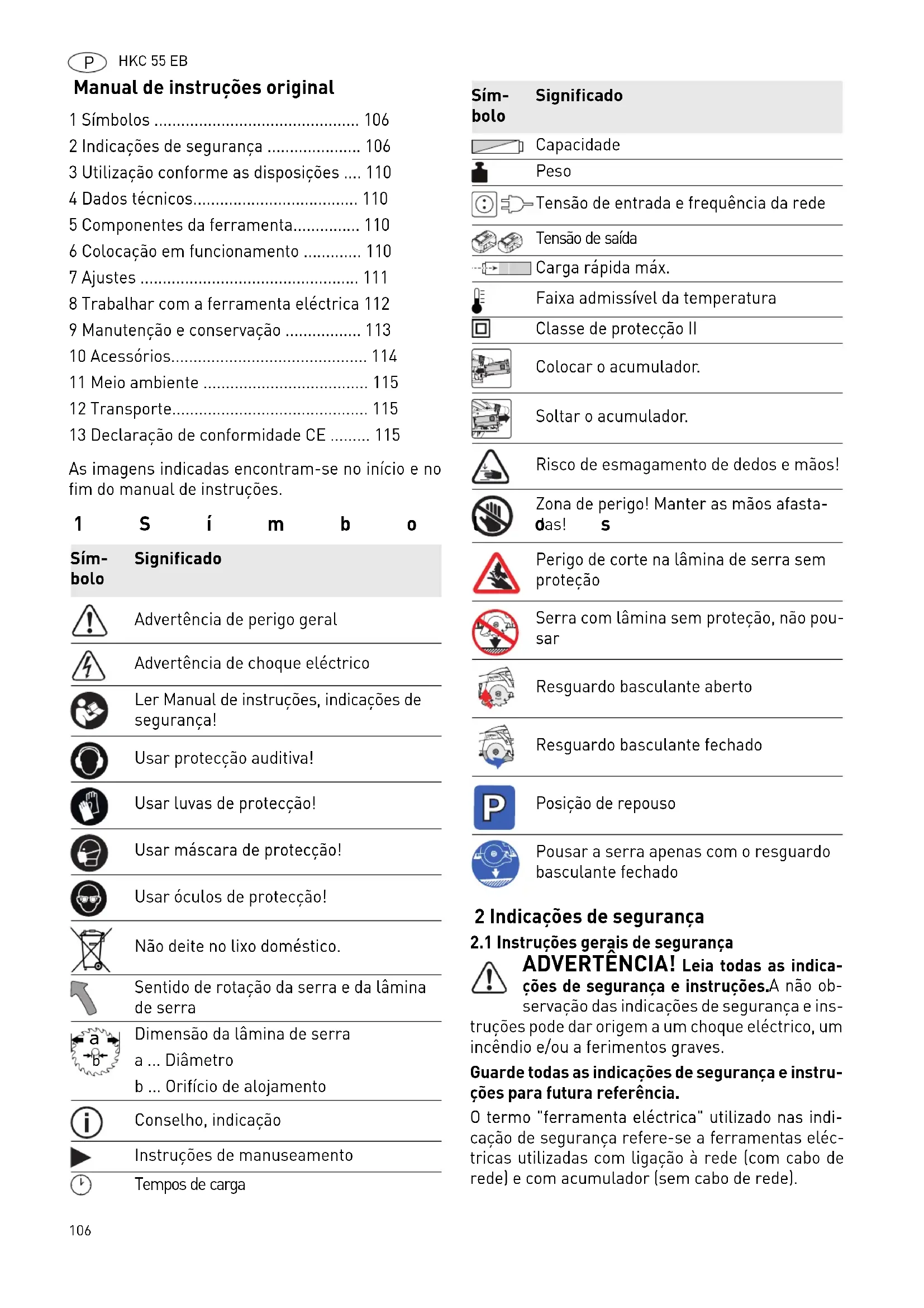 - ADVERTÊNCIA! Leia todas as indica- ções de segurança e instruções. A não ob- servação das indicações de segurança e ins- truções pode dar origem a um choque eléctrico, um incêndio e/ou a ferimentos graves. Guarde todas as indicações de segurança e instru- ções para futura referência. O termo "ferramenta eléctrica" utilizado nas indi- cação de segurança refere-se a ferramentas eléc- tricas utilizadas com ligação à rede (com cabo de rede) e com acumulador (sem cabo de rede). 1 Símbolos p. 106