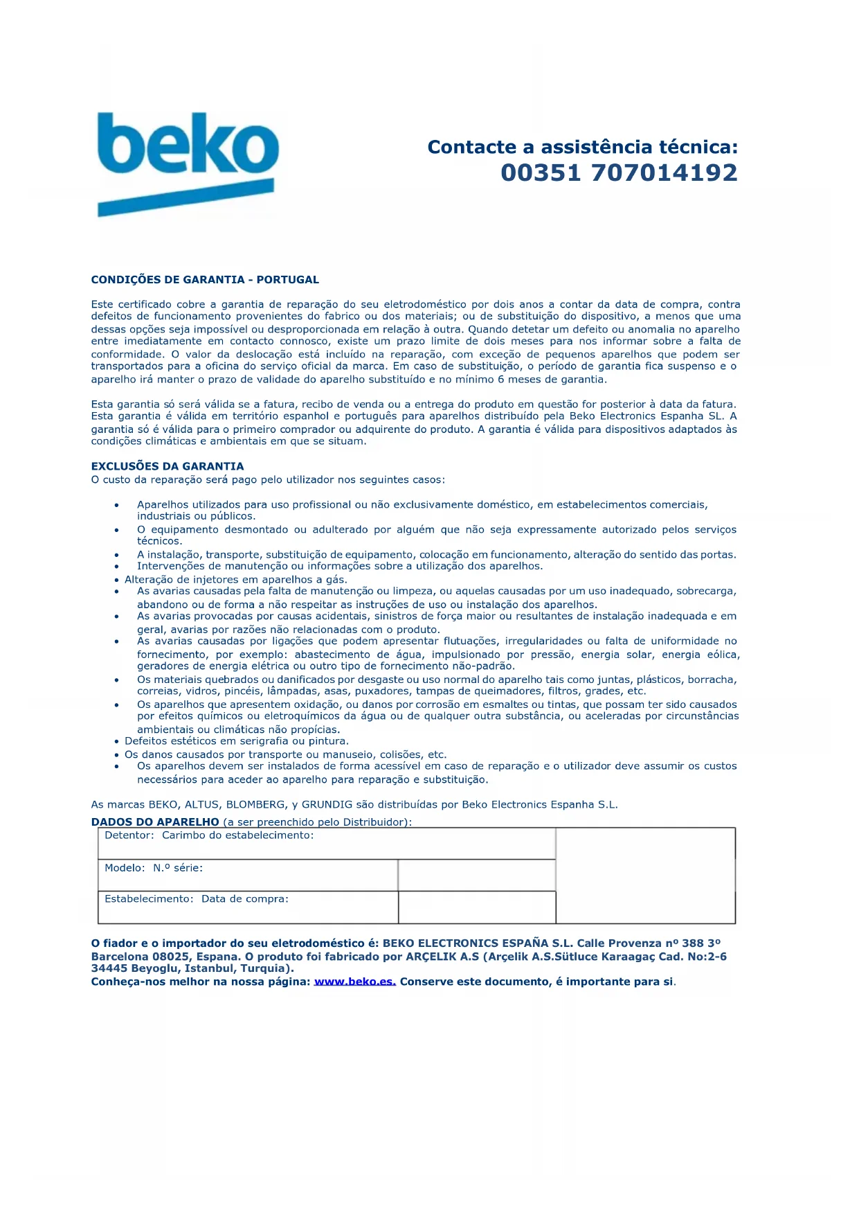 Este certificado cobre a garantia de reparação do seu eletrodoméstico por dois anos a contar da data de compra, contra defeitos de funcionamento provenientes do fabrico ou dos materiais; ou de substituição do dispositivo, a menos que uma dessas opções seja impossível ou desproporcionada em relação à outra. Quando detetar um defeito ou anomalia no aparelho entre imediatamente em contacto connosco, existe um prazo limite de dois meses para nos informar sobre a falta de conformidade. O valor da deslocação está incluído na reparação, com exceção de pequenos aparelhos que podem ser transportados para a oficina do serviço oficial da marca. Em caso de substituição, o período de garantia fica suspenso e o aparelho irá manter o prazo de validade do aparelho substituído e no mínimo 6 meses de garantia. Esta garantia só será válida se a fatura, recibo de venda ou a entrega do produto em questão for posterior à data da fatura. Esta garantia é válida em território espanhol e português para aparelhos distribuído pela Beko Electronics Espanha SL. A garantia só é válida para o primeiro comprador ou adquirente do produto. A garantia é válida para dispositivos adaptados às condições climáticas e ambientais em que se situam.