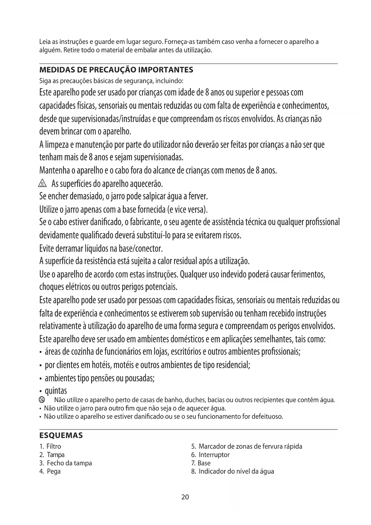 Siga as precauções básicas de segurança, incluindo: Este aparelho pode ser usado por crianças com idade de 8 anos ou superior e pessoas com capacidades físicas, sensoriais ou mentais reduzidas ou com falta de experiência e conhecimentos, desde que supervisionadas/instruídas e que compreendam os riscos envolvidos. As crianças não devem brincar com o aparelho. A limpeza e manutenção por parte do utilizador não deverão ser feitas por crianças a não ser que tenham mais de 8 anos e sejam supervisionadas. Mantenha o aparelho e o cabo fora do alcance de crianças com menos de 8 anos. h As superfícies do aparelho aquecerão. Se encher demasiado, o jarro pode salpicar água a ferver. Utilize o jarro apenas com a base fornecida (e vice versa). Se o cabo estiver danificado, o fabricante, o seu agente de assistência técnica ou qualquer profissional devidamente qualificado deverá substituí-lo para se evitarem riscos. Evite derramar líquidos na base/conector. A superfície da resistência está sujeita a calor residual após a utilização. Use o aparelho de acordo com estas instruções. Qualquer uso indevido poderá causar ferimentos, choques elétricos ou outros perigos potenciais. Este aparelho pode ser usado por pessoas com capacidades físicas, sensoriais ou mentais reduzidas ou falta de experiência e conhecimentos se estiverem sob supervisão ou tenham recebido instruções relativamente à utilização do aparelho de uma forma segura e compreendam os perigos envolvidos. Este aparelho deve ser usado em ambientes domésticos e em aplicações semelhantes, tais como: