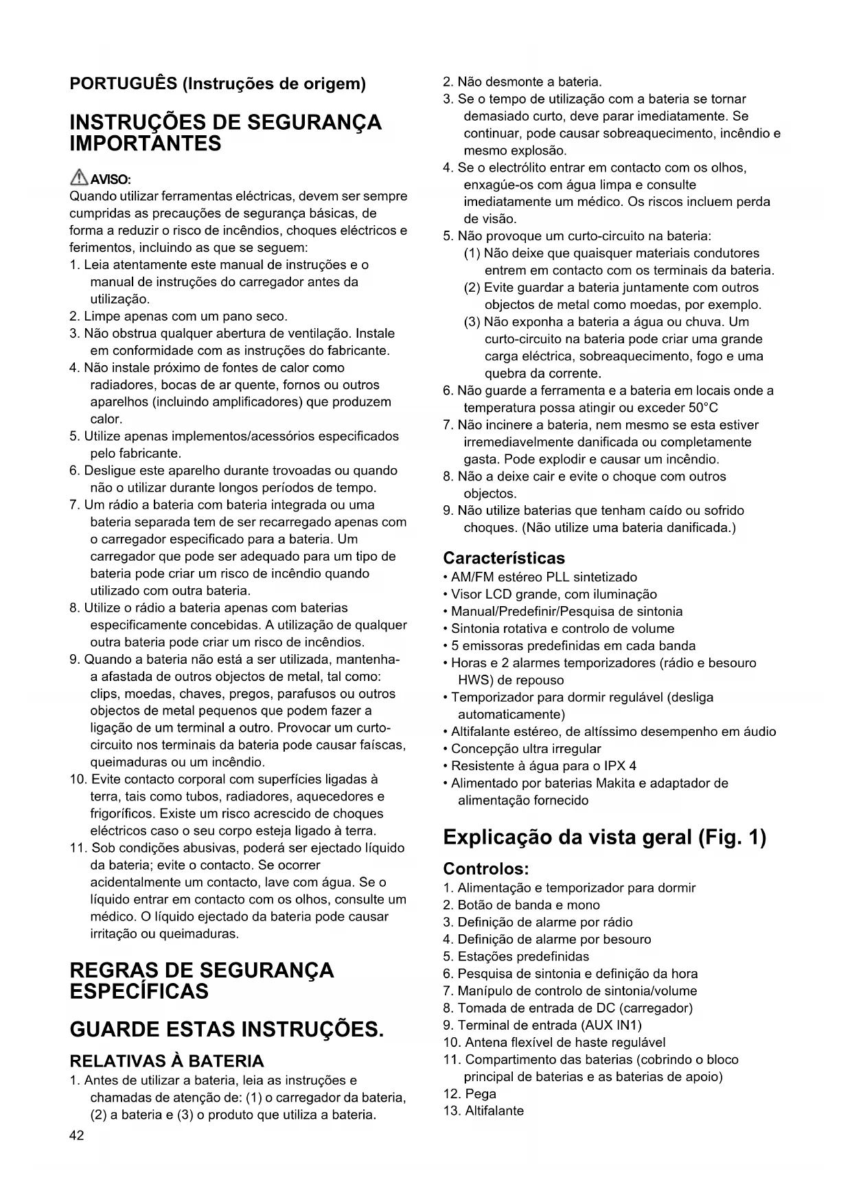 - Nunca utilize gasolina, benzina, diluente, álcool ou semelhante. Podem formar-se descolorações, deformações ou fissuras. Especificações: Requisitos de alimentação Adaptador de alimentação CA CC12 V 700 mA, pino central positivo Bateria UM-3 (tamanho AA) x 2 de reserva Bateria de grupo: 7,2 V - 18 V Bateria de deslize: 9,6 V - 18 V Cobertura de frequências FM 87,50 - 108 MHz (0,05 MHz/passo) AM (MW) 522 - 1.629 kHz (9 kHz/passo)47 Característica de circuito Altifalante 3 polegadas 8 ohm Potência de saída 7,2 V: 0,5 W x 2, 9,6 V: 1 W x 2 10,8 V: 1,2 W x 2, 12 V: 1,5 W x 2 14,4 V: 2,2 W x 2, 18 V: 3,5 W x 2 Terminal de entrada 3,5 mm de diâmetro (Entrada AUX 1/AUX 2) Sistema de antena FM: antena flexível de haste regulável AM: antena de barra Dimensão (L x A x P) em mm 280 x 302 x 163 Peso (sem bateria) 4,0 kg48 DANSK (Originalvejledning) VIGTIGE SIKKERHEDSINSTRUKTIONER ADVARSEL: Ved brug af elektriske maskiner skal de grundlæggende sikkerhedsforholdsregler altid overholdes for at reducere risikoen for brand, elektrisk stød og personskade, inklusive de følgende: