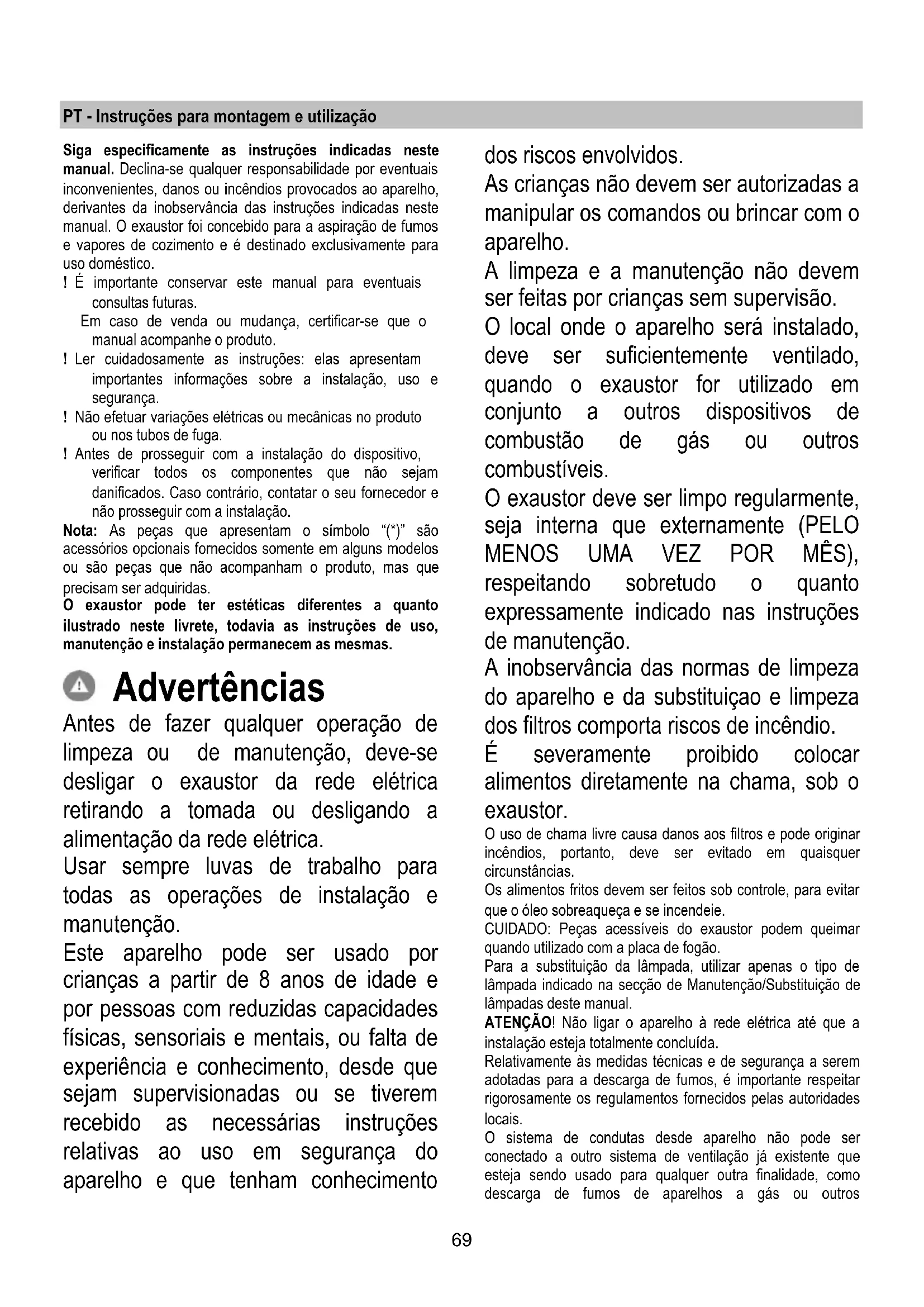 PRODUCTOS QUE CONTENGAN CLORO! Filtro antigrasa Fig. 28-29-30 Retiene las partículas de grasa producidas cuando se cocina. Se debe limpiar al menos una vez al mes (o cuando el sistema de indicación de saturación de los filtros – si se contempla en el modelo que se tiene – lo indica), con detergentes no agresivos, en lavavajillas con temperaturas bajas y ciclo breve (Tmáx.: 70 °C) Con el lavado en lavavajillas las partes metálicas podrían descolorarse. El filtro se debe secar en el horno a una temperatura máx. de 100 °C durante una hora; repita la operación si el filtro aún está húmedo. Sustituya el filtro al menos cada 2 años. ¡Atención! Después de realizar el mantenimiento del filtro, instale en el recipiente apropiado PRIMERO el filtro antigrasa, DESPUÉS el filtro de carbón. Este último se puede reconocer ya que está sellado dentro de una malla. Compruebe que cuando se haya colocado el recipiente, solo se pueda ver el filtro antigrasa. Filtro al carbón activo (solamente para la versión filtrante) Fig. 28-29-30 Retiene los olores desagradables producidos por la cocción de alimentos. ¡Atención! El filtro de carbón activo se puede reconocer porque está sellado dentro de una malla específica. Realice las operaciones de desmontaje, mantenimiento y limpieza del filtro manipulando el filtro con mucho cuidado para no estropear o abrir la malla. El filtro al carbón puede lavarse cada dos meses (o cuando el sistema de indicación de saturación de los filtros - si está previsto en el modelo que se posee - indica esta necesidad) con agua caliente y detergentes adecuados o en lavavajillas a 65°C ( en caso de lavado con lavavajillas, realice el ciclo de lavado completo sin platos en el interior.). Quite el agua que haya quedado en el filtro sin estropearlo, después póngalo en el horno a 100°C durante diez minutos para secarlo completamente. Cambie el almohadillado cada 3 años y cada vez que el paño se estropee. ¡Atención! Después de realizar el mantenimiento del filtro, instale en el recipiente apropiado PRIMERO el filtro antigrasa, DESPUÉS el filtro de carbón. Este último se puede reconocer ya que está sellado dentro de una malla. Compruebe que cuando se haya colocado el recipiente, solo se pueda ver el filtro antigrasa. Sustitución de la lámpara Fig. 29 La campana viene provista de un sistema de iluminación basado en la tecnología LED. Los LEDS garantizan una óptima iluminación, una duración hasta 10 veces mayor de las lámparas tradicionales y permiten aborra el 90% de energía eléctrica. . Compre los leds que se deben cambiar, solo a través del servicio de asistencia técnica.69 PT - Instruções para montagem e utilização Siga especificamente as instruções indicadas neste manual. Declina-se qualquer responsabilidade por eventuais inconvenientes, danos ou incêndios provocados ao aparelho, derivantes da inobservância das instruções indicadas neste manual. O exaustor foi concebido para a aspiração de fumos e vapores de cozimento e é destinado exclusivamente para uso doméstico. ! É importante conservar este manual para eventuais consultas futuras. Em caso de venda ou mudança, certificar-se que o manual acompanhe o produto. ! Ler cuidadosamente as instruções: elas apresentam importantes informações sobre a instalação, uso e segurança. ! Não efetuar variações elétricas ou mecânicas no produto ou nos tubos de fuga. ! Antes de prosseguir com a instalação do dispositivo, verificar todos os componentes que não sejam danificados. Caso contrário, contatar o seu fornecedor e não prosseguir com a instalação. Nota: As peças que apresentam o símbolo “(*)” são acessórios opcionais fornecidos somente em alguns modelos ou são peças que não acompanham o produto, mas que precisam ser adquiridas. O exaustor pode ter estéticas diferentes a quanto ilustrado neste livrete, todavia as instruções de uso, manutenção e instalação permanecem as mesmas. Advertências Antes de fazer qualquer operação de limpeza ou de manutenção, deve-se desligar o exaustor da rede elétrica retirando a tomada ou desligando a alimentação da rede elétrica. Usar sempre luvas de trabalho para todas as operações de instalação e manutenção. Este aparelho pode ser usado por crianças a partir de 8 anos de idade e por pessoas com reduzidas capacidades físicas, sensoriais e mentais, ou falta de experiência e conhecimento, desde que sejam supervisionadas ou se tiverem recebido as necessárias instruções relativas ao uso em segurança do aparelho e que tenham conhecimento dos riscos envolvidos. As crianças não devem ser autorizadas a manipular os comandos ou brincar com o aparelho. A limpeza e a manutenção não devem ser feitas por crianças sem supervisão. O local onde o aparelho será instalado, deve ser suficientemente ventilado, quando o exaustor for utilizado em conjunto a outros dispositivos de combustão de gás ou outros combustíveis. O exaustor deve ser limpo regularmente, seja interna que externamente (PELO MENOS UMA VEZ POR MÊS), respeitando sobretudo o quanto expressamente indicado nas instruções de manutenção. A inobservância das normas de limpeza do aparelho e da substituiçao e limpeza dos filtros comporta riscos de incêndio. É severamente proibido colocar alimentos diretamente na chama, sob o exaustor. O uso de chama livre causa danos aos filtros e pode originar incêndios, portanto, deve ser evitado em quaisquer circunstâncias. Os alimentos fritos devem ser feitos sob controle, para evitar que o óleo sobreaqueça e se incendeie. CUIDADO: Peças acessíveis do exaustor podem queimar quando utilizado com a placa de fogão. Para a substituição da lâmpada, utilizar apenas o tipo de lâmpada indicado na secção de Manutenção/Substituição de lâmpadas deste manual. ATENÇÃO! Não ligar o aparelho à rede elétrica até que a instalação esteja totalmente concluída. Relativamente às medidas t