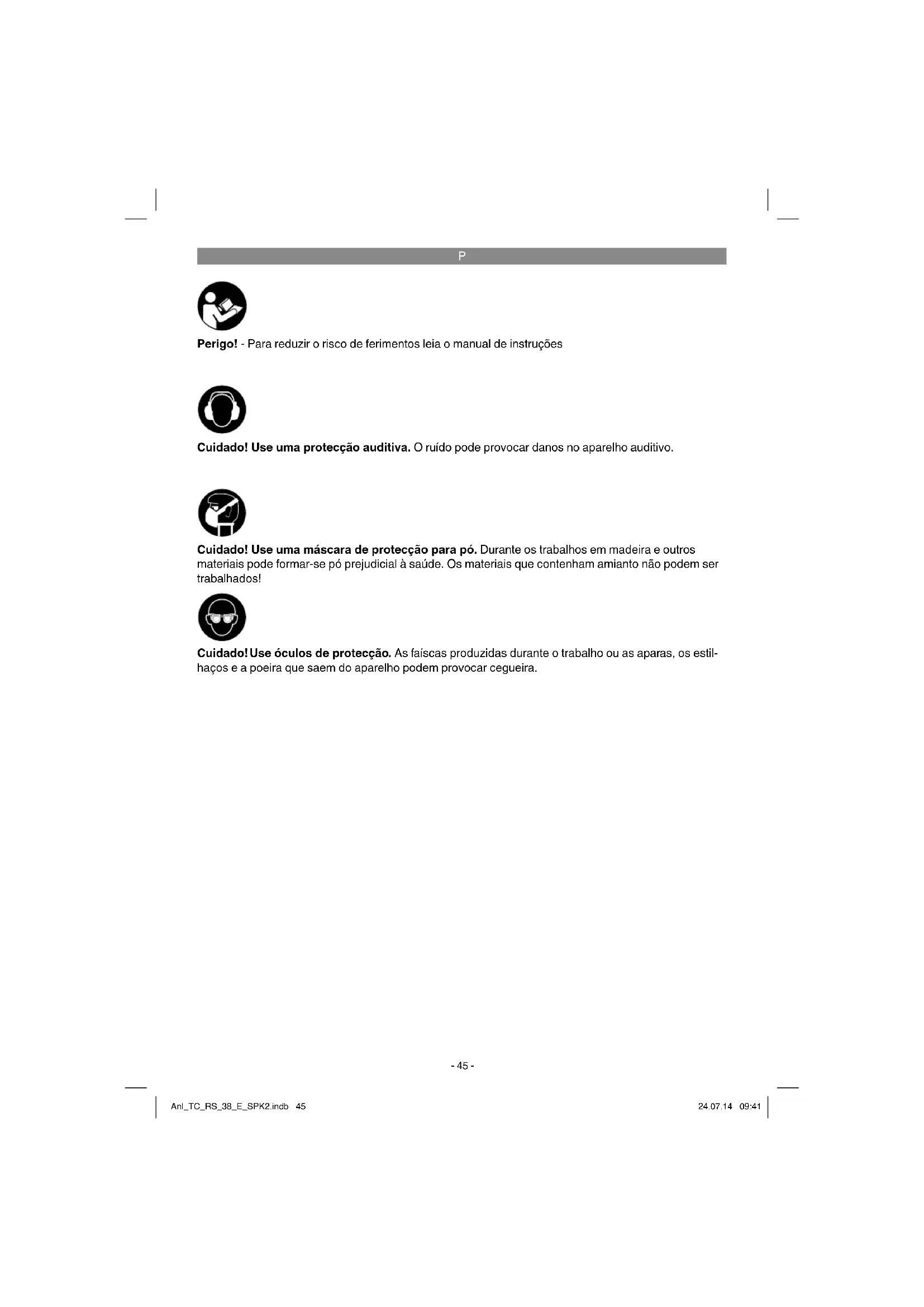 Perigo! - Para reduzir o risco de ferimentos leia o manual de instruções Cuidado! Use uma protecção auditiva. O ruído pode provocar danos no aparelho auditivo. Cuidado! Use óculos de protecção. As faíscas produzidas durante o trabalho ou as aparas, os estil- haços e a poeira que saem do aparelho podem provocar cegueira. Cuidado! Use uma máscara de protecção para pó. Durante os trabalhos em madeira e outros materiais pode formar-se pó prejudicial à saúde. Os materiais que contenham amianto não podem ser trabalhados! Anl_TC_RS_38_E_SPK2.indb 45Anl_TC_RS_38_E_SPK2.indb 45 24.07.14 09:4124.07.14 09:41P