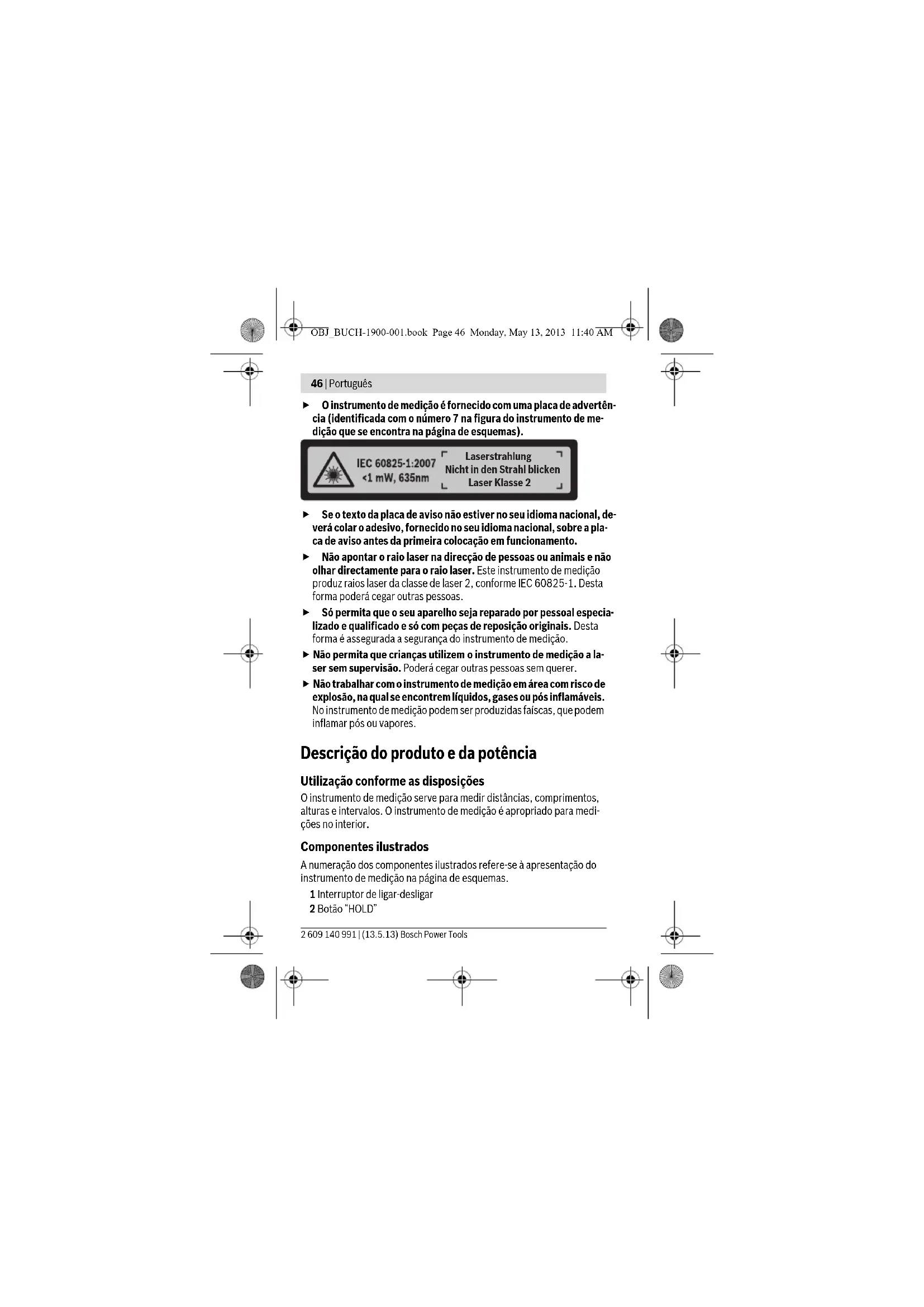 Tipo de laser 635 nm, <1 mW OBJ_BUCH-1900-001.book Page 47 Monday, May 13, 2013 11:40 AM48 | Português 2 609 140 991 | (13.5.13) Bosch Power Tools Montagem Introduzir/substituir pilhas Para o funcionamento do instrumento de medição é recomendável usar pilhas de manganês alcalinas. Para abrir a tampa do compartimento das pilhas 4 ,prima o travamento 5 na direcção da seta e retire a tampa. Insira as pilhas. Tenha atenção à po- laridade correcta de acordo com a representação no interior do compar- timento das pilhas. Quando o símbolo das pilhas surgir no mostrador pela primeira vez, ainda é possível realizar medições durante aprox. 15 minutos. Quando o símbolo das pilhas piscar, terá de substituir as pilhas, deixando de ser possível realizar medições. Diâmetro do raio laser (a 25 °C) em uma dis- tância de 10 m, aprox. 9mm Pilhas 2 x 1,5 V LR03 (AAA) Autonomia das pilhas durante a medição de aprox.