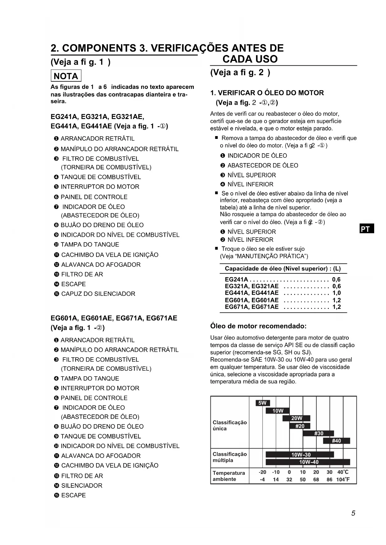 - ,2EG671A, EG671AE ,2 Óleo de motor recomendado: Usar óleo automotivo detergente para motor de quatro tempos da classe de serviço API SE ou de classi cação superior (recomenda-se SG, SH ou SJ).Recomenda-se SAE 10W-30 ou 10W-40 para uso geral em qualquer temperatura. Se usar óleo de viscosidade única, selecione a viscosidade apropriada para a temperatura média de sua região. p. 1