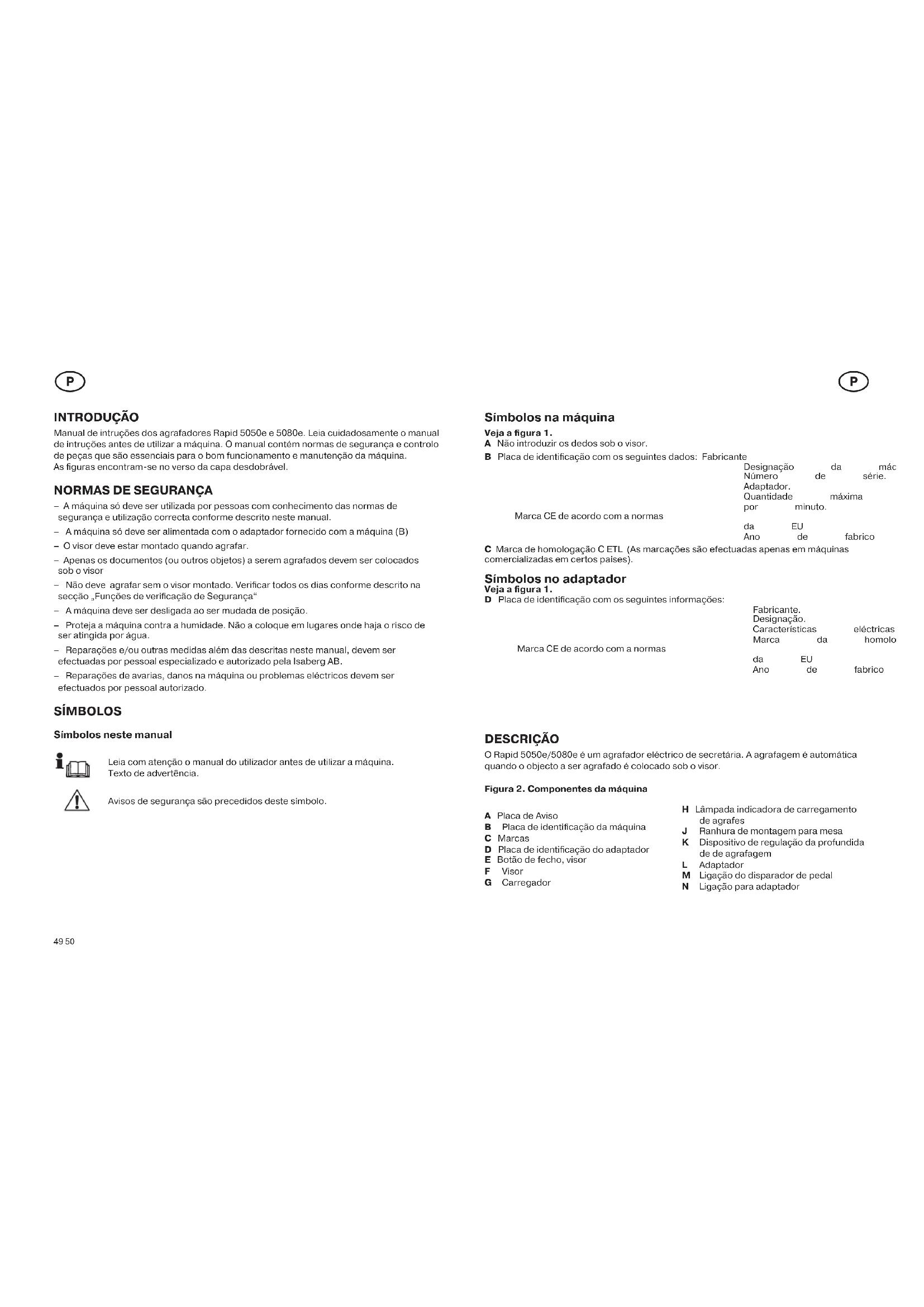 Símbolos na máquina Veja a figura 1. A Não introduzir os dedos sob o visor. B Placa de identificação com os seguintes dados: Fabricante Designação da máquina. Número de série. Adaptador. Quantidade máxima de agrafagens por minuto. Marca CE de acordo com a normas da EU Ano de fabrico C Marca de homologação C ETL (As marcações são efectuadas apenas em máquinas comercializadas em certos países). Símbolos no adaptador Veja a figura 1. D Placa de identificação com os seguintes informações: Fabricante. Designação. Características eléctricas Marca da homologação Marca CE de acordo com a normas da EU Ano de fabrico DESCRIÇÃO O Rapid 5050e/5080e é um agrafador eléctrico de secretária. A agrafagem é automática quando o objecto a ser agrafado é colocado sob o visor. Figura 2. Componentes da máquina A Placa de Aviso B Placa de identificação da máquina C Marcas D Placa de identificação do adaptador E Botão de fecho, visor F Visor G Carregador H Lâmpada indicadora de carregamento de agrafes J Ranhura de montagem para mesa K Dispositivo de regulação da profundida de de agrafagem L Adaptador M Ligação do disparador de pedal N Ligação para adaptador
