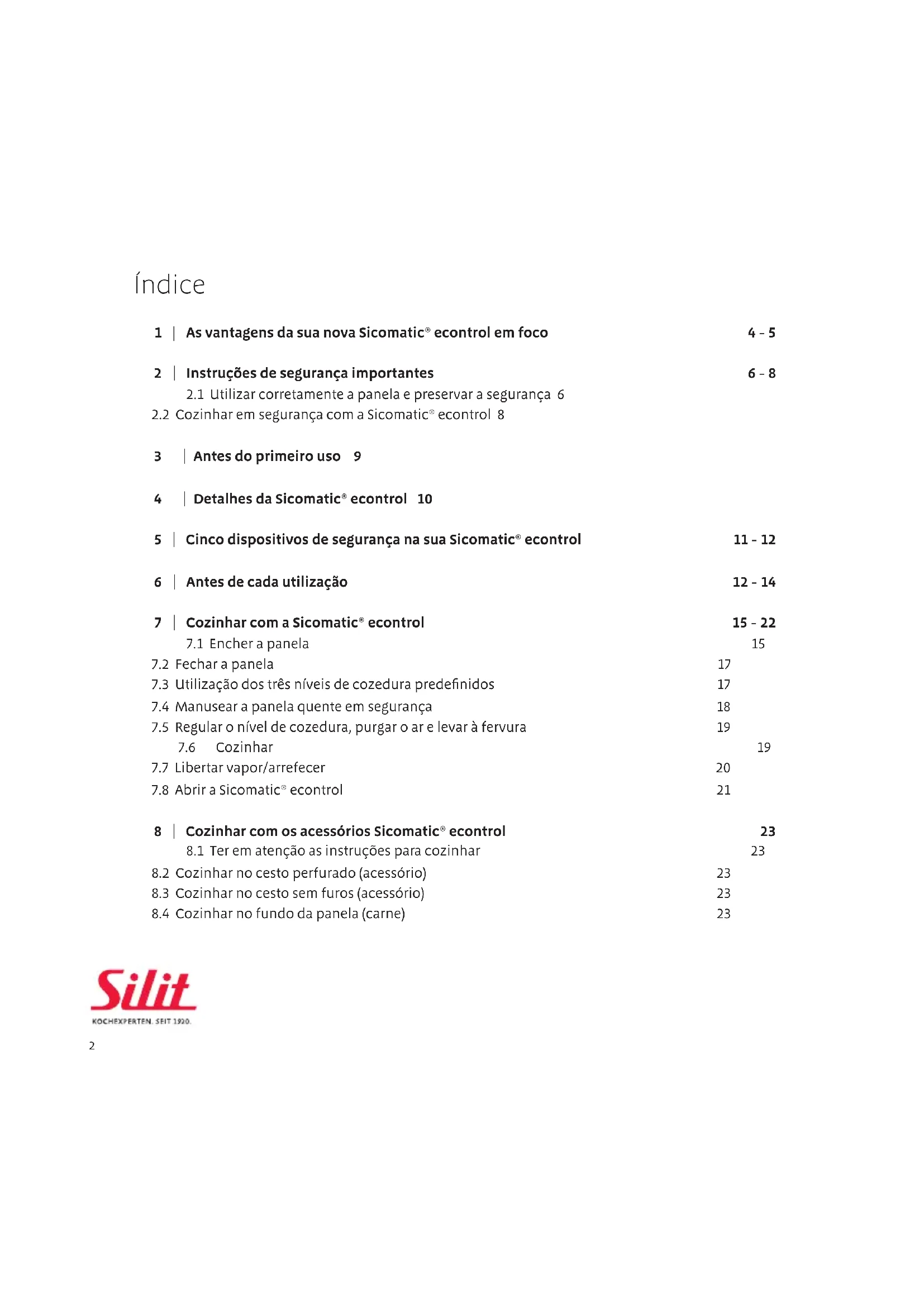 3 | Antes do primeiro uso 9 4 | Detalhes da Sicomatic® econtrol 10 5 | Cinco dispositivos de segurança na sua Sicomatic® econtrol 11 - 12 6 | Antes de cada utilização 12 - 14 7 | Cozinhar com a Sicomatic® econtrol 15 - 22