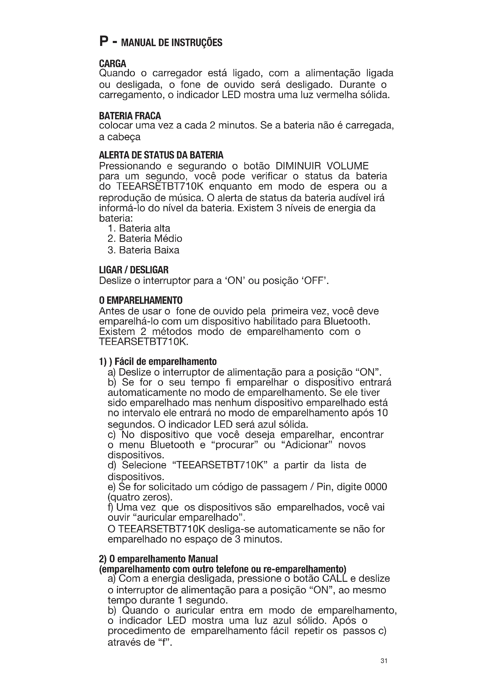 a) Deslize o interruptor de alimentação para a posição “ON”. b) Se for o seu tempo emparelhar o dispositivo entrará automaticamente no modo de emparelhamento. Se ele tiver sido emparelhado mas nenhum dispositivo emparelhado está no intervalo ele entrará no modo de emparelhamento após 10 segundos. O indicador LED será azul sólida. c) No dispositivo que você deseja emparelhar, encontrar o menu Bluetooth e “procurar” ou “Adicionar” novos dispositivos. d) Selecione “TEEARSETBT710K” a partir da lista de dispositivos. e) Se for solicitado um código de passagem / Pin, digite 0000 (quatro zeros). f) Uma vez que os dispositivos são emparelhados, você vai ouvir “auricular emparelhado”. O TEEARSETBT710K desliga-se automaticamente se não for emparelhado no espaço de 3 minutos.