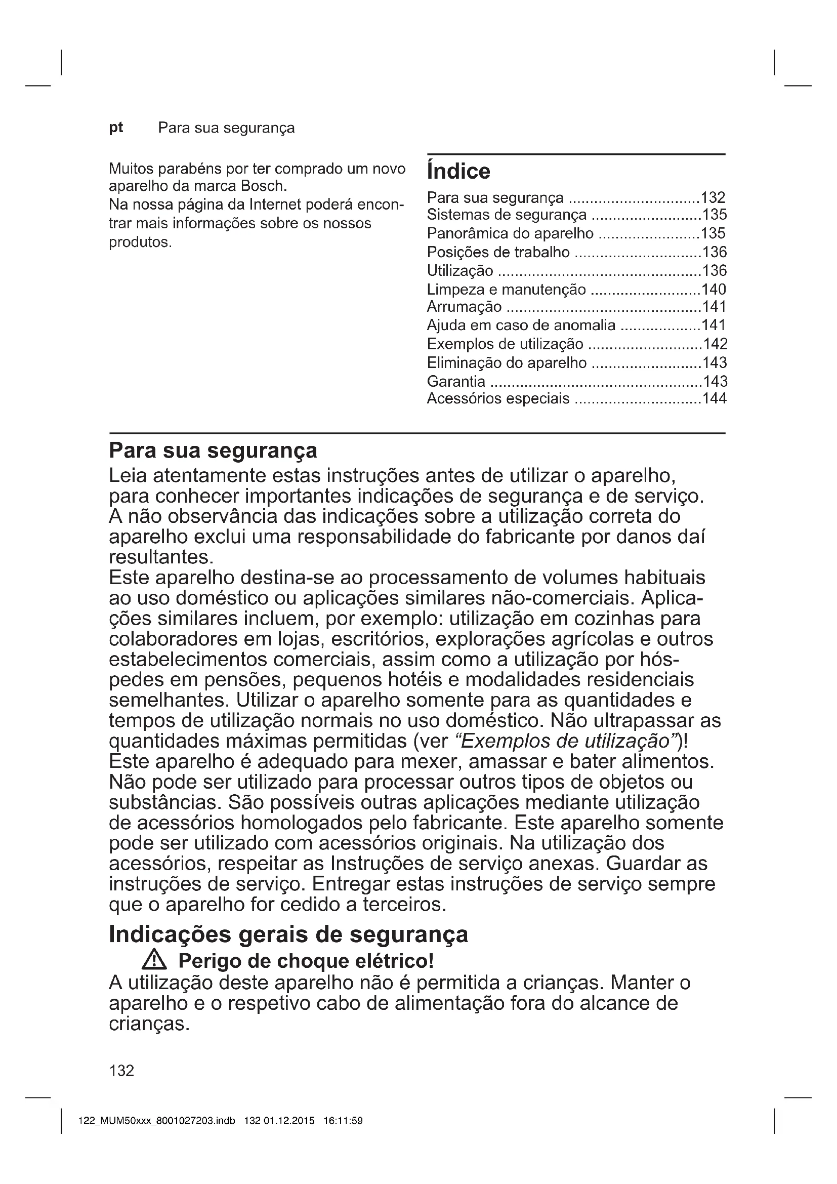 - Parasuasegurança Muitosparabénsportercompradoumnovo aparelhodamarcaBosch. NanossapáginadaInternetpoderáencon- trarmaisinformaçõessobreosnossos produtos. Índice Parasuasegurança p. 132
