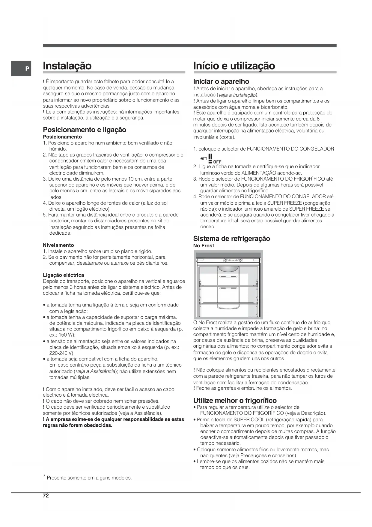 - Presente somente em alguns modelos. Instalação ! É importante guardar este folheto para poder consultá-lo aqualquer momento. No caso de venda, cessão ou mudança,assegure-se que o mesmo permaneça junto com o aparelhopara informar ao novo proprietário sobre o funcionamento e assuas respectivas advertências.