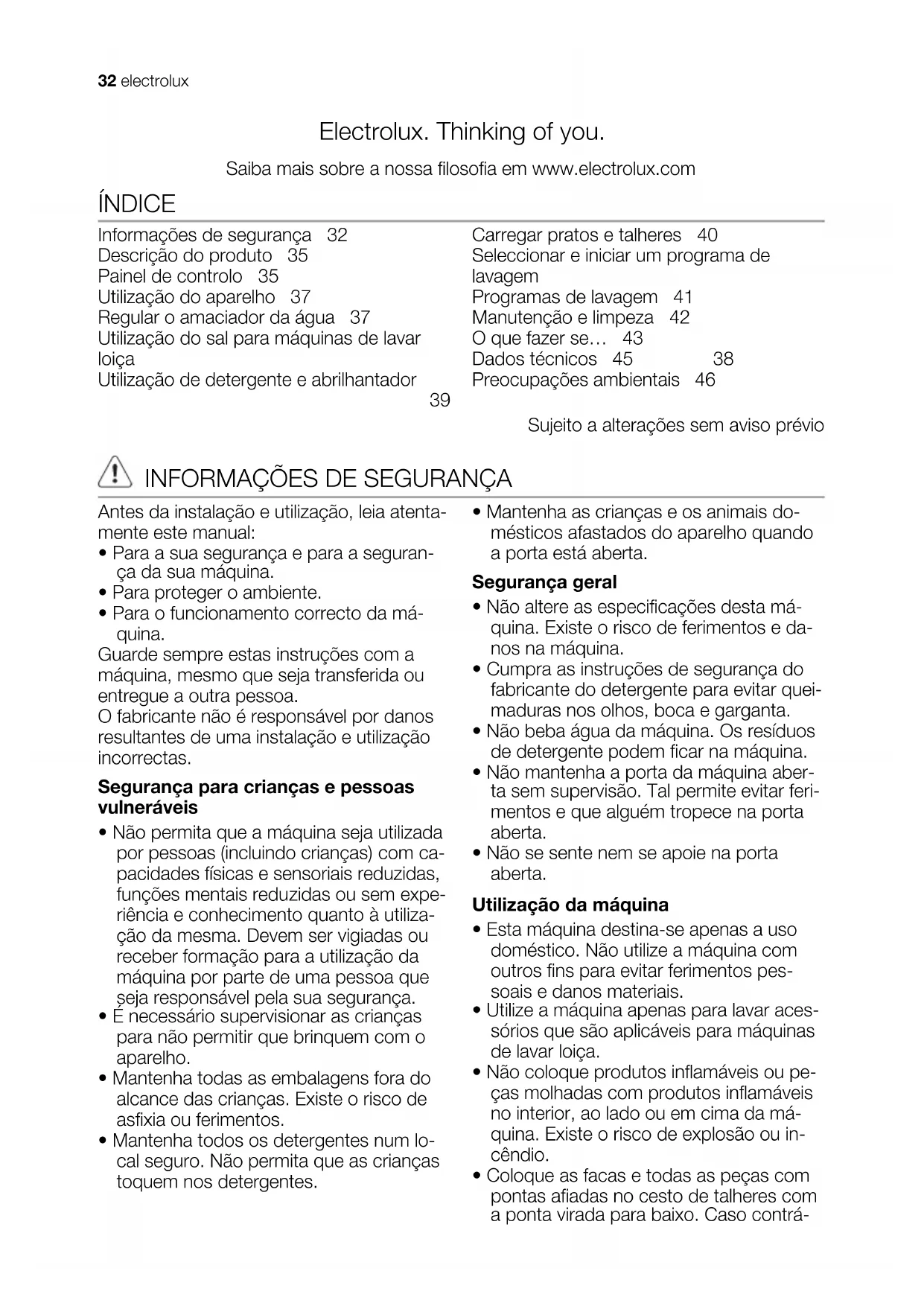 Ανακυκλώνετε τα υλικά με το σύμβολο . Τοποθετείτε τη συσκευασία σε κατάλλη- λα δοχεία για ανακύκλωση. electrolux 31Electrolux. Thinking of you. Saiba mais sobre a nossa filosofia em www.electrolux.com ÍNDICE Informações de segurança 32 Descrição do produto 35 Painel de controlo 35 Utilização do aparelho 37 Regular o amaciador da água 37 Utilização do sal para máquinas de lavar loiça 38 Utilização de detergente e abrilhantador