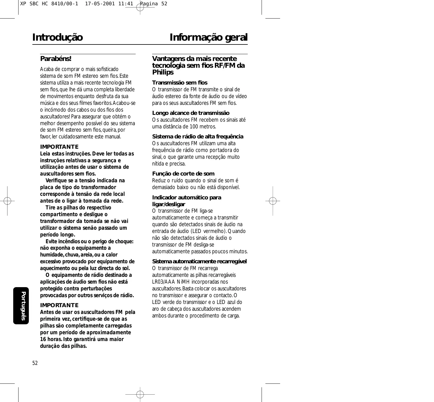 17-05-2001 11:41 Introdução Parabéns! Acaba de comprar o mais sofisticado sistema de som FM estereo sem fios. Este sistema utiliza a mais recente tecnologia FM sem fios, que lhe dá uma completa liberdade de movimentos enquanto desfruta da sua música e dos seus filmes favoritos. Acabou-se o incómodo dos cabos ou dos fios dos auscultadores! Para assegurar que obtém o melhor desempenho possível do seu sistema de som FM estereo sem fios, queira, por favor, ler cuidadosamente este manual. Português IMPORTANTE Leia estas instruções. Deve ler todas as instruções relativas a segurança e utilização antes de usar o sistema de auscultadores sem fios. Verifique se a tensão indicada na placa de tipo do transformador corresponde à tensão da rede local antes de o ligar à tomada da rede. Tire as pilhas do respectivo compartimento e desligue o transformador da tomada se não vai utilizar o sistema senão passado um período longo. Evite incêndios ou o perigo de choque: não exponha o equipamento a humidade, chuva, areia, ou a calor excessivo provocado por equipamento de aquecimento ou pela luz directa do sol. O equipamento de rádio destinado a aplicações de áudio sem fios não está protegido contra perturbações provocadas por outros serviços de rádio. IMPORTANTE Antes de usar os auscultadores FM pela primeira vez, certifique-se de que as pilhas são completamente carregadas por um período de aproximadamente 16 horas. Isto garantirá uma maior duração das pilhas.