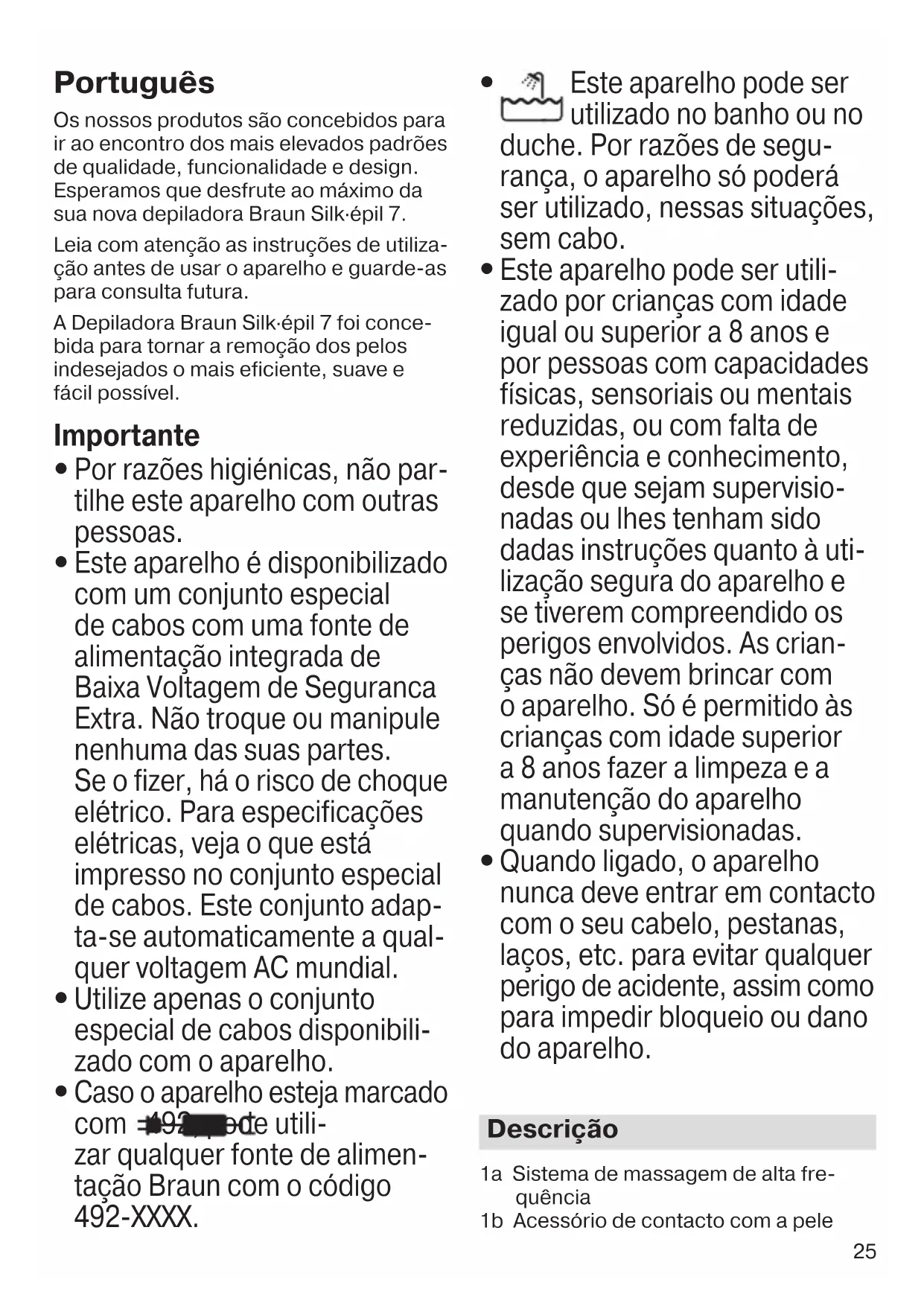 Caso o aparelho esteja marcado com 492, pode utili- zar qualquer fonte de alimen- tação Braun com o código 492-XXXX.