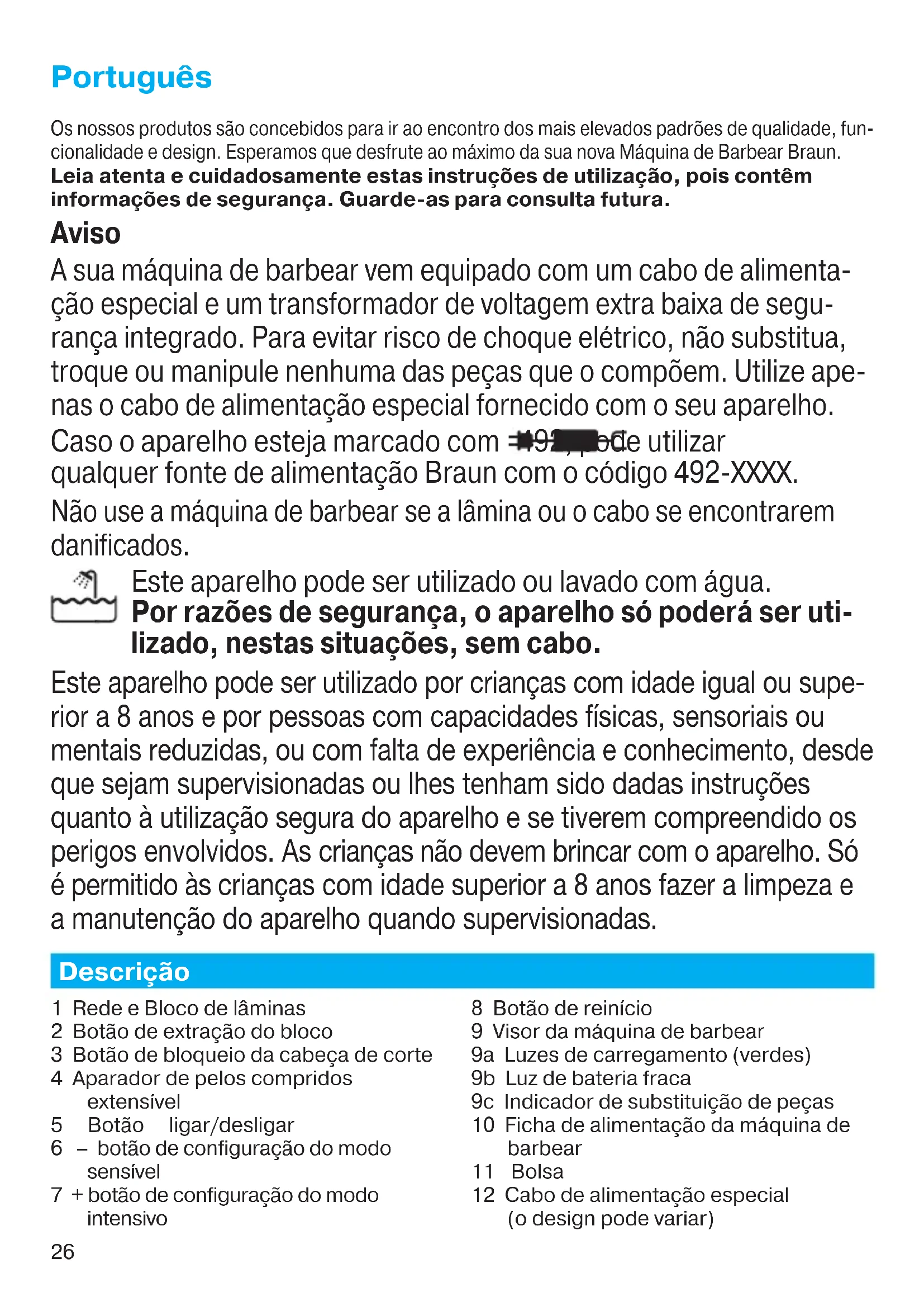 cuchillas en agua caliente. Después enjuáguelo concienzudamente y sacúdalo. Una vez esté seco aplique una gota de aceite lubricante ligero para máquinas en la lámina. La afeitadora se apaga con la batería completamente cargada. La lámina y el recortador están desgastados por lo que se necesita más potencia para cada afeitado. – Reemplace el bloque de lámina y cuchillas. – Lubrique regularmente el sistema de corte, especialmente cuando lo limpie solo con agua. Los indicadores de nivel de carga aparecen discontinuos y con baja intensidad. La lámina y el recortador están desgastados por lo que se necesita más potencia para cada afeitado. – Reemplace el bloque de lámina y cuchillas. – Lubrique regularmente el sistema de corte, especialmente cuando lo limpie solo con agua. Los elementos de corte se han cambiado recientemente pero el símbolo de cambio aparece encendido. El botón de reinicio no ha sido pulsado. – Pulse el botón de reinicio durante al menos 3 segundos para reiniciar el contador. 91153500_Series_7-8_Solo_EURO_S6-140.indd 2591153500_Series_7-8_Solo_EURO_S6-140.indd 25 28.11.16 13:4228.11.16 13:42 CSS APPROVED Effective Date 30Nov2016 GMT - Printed 04Jan2017 Page 24 of 13926 Português Os nossos produtos são concebidos para ir ao encontro dos mais elevados padrões de qualidade, fun- cionalidade e design. Esperamos que desfrute ao máximo da sua nova Máquina de Barbear Braun. Leia atenta e cuidadosamente estas instruções de utilização, pois contêm informações de segurança. Guarde-as para consulta futura. Aviso A sua máquina de barbear vem equipado com um cabo de alimenta- ção especial e um transformador de voltagem extra baixa de segu- rança integrado. Para evitar risco de choque elétrico, não substitua, troque ou manipule nenhuma das peças que o compõem. Utilize ape- nas o cabo de alimentação especial fornecido com o seu aparelho. Caso o aparelho esteja marcado com 492, pode utilizar qualquer fonte de alimentação Braun com o código 492-XXXX. Não use a máquina de barbear se a lâmina ou o cabo se encontrarem danificados. Este aparelho pode ser utilizado ou lavado com água. Por razões de segurança, o aparelho só poderá ser uti- lizado, nestas situações, sem cabo. Este aparelho pode ser utilizado por crianças com idade igual ou supe- rior a 8 anos e por pessoas com capacidades físicas, sensoriais ou mentais reduzidas, ou com falta de experiência e conhecimento, desde que sejam supervisionadas ou lhes tenham sido dadas instruções quanto à utilização segura do aparelho e se tiverem compreendido os perigos envolvidos. As crianças não devem brincar com o aparelho. Só é permitido às crianças com idade superior a 8 anos fazer a limpeza e a manutenção do aparelho quando supervisionadas. Descrição 1 Rede e Bloco de lâminas 2 Botão de extração do bloco 3 Botão de bloqueio da cabeça de corte 4 Aparador de pelos compridos extensível 5 Botão ligar/desligar 6 – botão de configuração do modo sensível 7 + botão de configuração do modo intensivo 8 Botão de reinício 9 Visor da máquina de barbear 9a Luzes de carregamento (verdes) 9b Luz de bateria fraca 9c Indicador de substituição de peças 10 Ficha de alimentação da máquina de barbear 11 Bolsa 12 Cabo de alimentação especial (o design pode variar) 91153500_Series_7-8_Solo_EURO_S6-140.indd 2691153500_Series_7-8_Solo_EURO_S6-140.indd 26 28.11.16 13:4228.11.16 13:42 CSS APPROVED Effective Date 30Nov2016 GMT - Printed 04Jan2017 Page 25 of 13927 Carga da máquina de barbear A temperatura ambiente ideal para carregar a sua máquina de barbear é de 5 °C a 35 °C. A bateria pode não carregar ou não carregar devidamente em temperaturas extremamente altas ou baixas. A temperatura ideal para se barbear é de 15 °C a 35 °C. Não exponha o aparelho a temperaturas superiores a 50 °C por períodos prolongados.