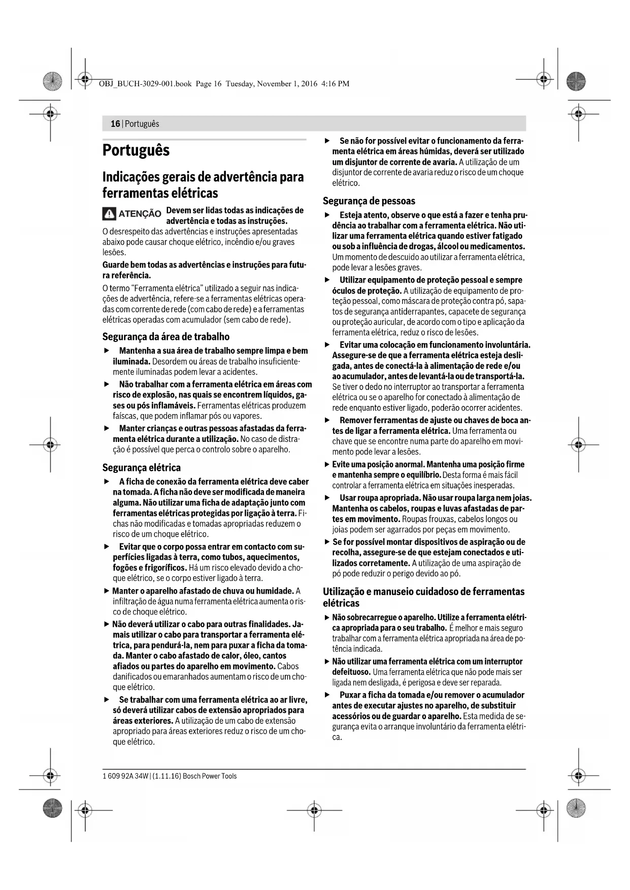 Sélection des accessoires – 82 Opération Figure Respectez Page OBJ_BUCH-3029-001.book Page 15 Tuesday, November 1, 2016 4:16 PM16 | Português 1 609 92A 34W | (1.11.16) Bosch Power Tools Português Indicações gerais de advertência para ferramentas elétricas Devem ser lidas todas as indicações de advertência e todas as instruções. O desrespeito das advertências e instruções apresentadas abaixo pode causar choque elétrico, incêndio e/ou graves lesões. Guarde bem todas as advertências e instruções para futu- ra referência. O termo “Ferramenta elétrica” utilizado a seguir nas indica- ções de advertência, refere-se a ferramentas elétricas opera- das com corrente de rede (com cabo de rede) e a ferramentas elétricas operadas com acumulador (sem cabo de rede). Segurança da área de trabalho Mantenha a sua área de trabalho sempre limpa e bem iluminada. Desordem ou áreas de trabalho insuficiente- mente iluminadas podem levar a acidentes. Não trabalhar com a ferramenta elétrica em áreas com risco de explosão, nas quais se encontrem líquidos, ga- ses ou pós inflamáveis. Ferramentas elétricas produzem faíscas, que podem inflamar pós ou vapores. Manter crianças e outras pessoas afastadas da ferra- menta elétrica durante a utilização. No caso de distra- ção é possível que perca o controlo sobre o aparelho. Segurança elétrica A ficha de conexão da ferramenta elétrica deve caber na tomada. A ficha não deve ser modificada de maneira alguma. Não utilizar uma ficha de adaptação junto com ferramentas elétricas protegidas por ligação à terra. Fi- chas não modificadas e tomadas apropriadas reduzem o risco de um choque elétrico. Evitar que o corpo possa entrar em contacto com su- perfícies ligadas à terra, como tubos, aquecimentos, fogões e frigoríficos. Há um risco elevado devido a cho- que elétrico, se o corpo estiver ligado à terra. Manter o aparelho afastado de chuva ou humidade. A infiltração de água numa ferramenta elétrica aumenta o ris- co de choque elétrico. Não deverá utilizar o cabo para outras finalidades. Ja- mais utilizar o cabo para transportar a ferramenta elé- trica, para pendurá-la, nem para puxar a ficha da toma- da. Manter o cabo afastado de calor, óleo, cantos afiados ou partes do aparelho em movimento. Cabos danificados ou emaranhados aumentam o risco de um cho- que elétrico. Se trabalhar com uma ferramenta elétrica ao ar livre, só deverá utilizar cabos de extensão apropriados para áreas exteriores. A utilização de um cabo de extensão apropriado para áreas exteriores reduz o risco de um cho- que elétrico. Se não for possível evitar o funcionamento da ferra- menta elétrica em áreas húmidas, deverá ser utilizado um disjuntor de corrente de avaria. A utilização de um disjuntor de corrente de avaria reduz o risco de um choque elétrico. Segurança de pessoas Esteja atento, observe o que está a fazer e tenha pru- dência ao trabalhar com a ferramenta elétrica. Não uti- lizar uma ferramenta elétrica quando estiver fatigado ou sob a influência de drogas, álcool ou medicamentos. Um momento de descuido ao utilizar a ferramenta elétrica, pode levar a lesões graves. Utilizar equipamento de proteção pessoal e sempre óculos de proteção. A utilização de equipamento de pro- teção pessoal, como máscara de proteção contra pó, sapa- tos de segurança antiderrapantes, capacete de segurança ou proteção auricular, de acordo com o tipo e aplicação da ferramenta elétrica, reduz o risco de lesões. Evitar uma colocação em funcionamento involuntária. Assegure-se de que a ferramenta elétrica esteja desli- gada, antes de conectá-la à alimentação de rede e/ou ao acumulador, antes de levantá-la ou de transportá-la. Se tiver o dedo no interruptor ao transportar a ferramenta elétrica ou se o aparelho for conectado à alimentação de rede enquanto estiver ligado, poderão ocorrer acidentes. Remover ferramentas de ajuste ou chaves de boca an- tes de ligar a ferramenta elétrica. Uma ferramenta ou chave que se encontre numa parte do aparelho em movi- mento pode levar a lesões.
