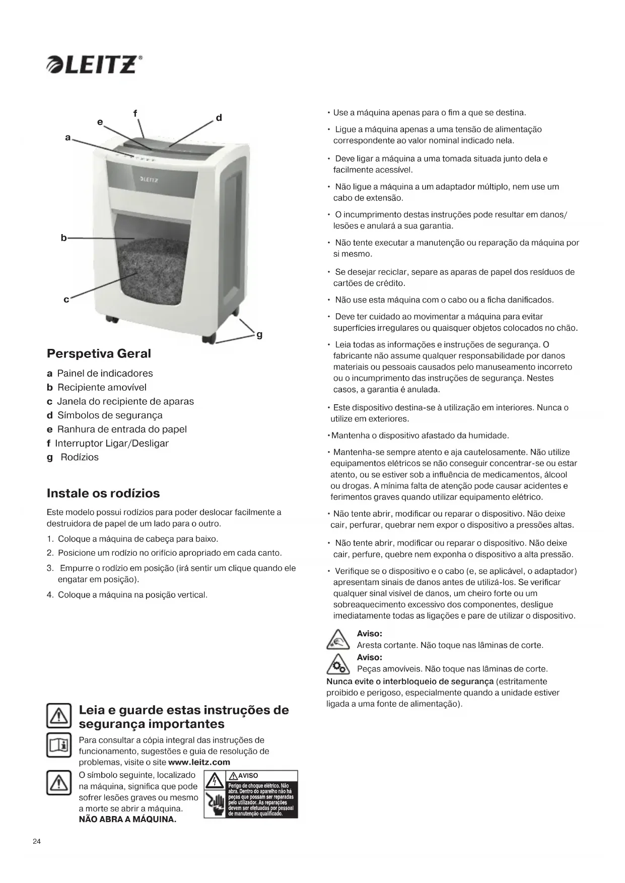 Leia e guarde estas instruções de segurança importantes Para consultar a cópia integral das instruções de funcionamento, sugestões e guia de resolução de problemas, visite o site www.leitz.com Nunca evite o interbloqueio de segurança (estritamente proibido e perigoso, especialmente quando a unidade estiver ligada a uma fonte de alimentação). Aviso: Aresta cortante. Não toque nas lâminas de corte. Aviso: Peças amovíveis. Não toque nas lâminas de corte. Perspetiva Geral a Painel de indicadores b Recipiente amovível c Janela do recipiente de aparas d Símbolos de segurança e Ranhura de entrada do papel f Interruptor Ligar/Desligar g Rodízios Instale os rodízios Este modelo possui rodízios para poder deslocar facilmente a destruidora de papel de um lado para o outro.