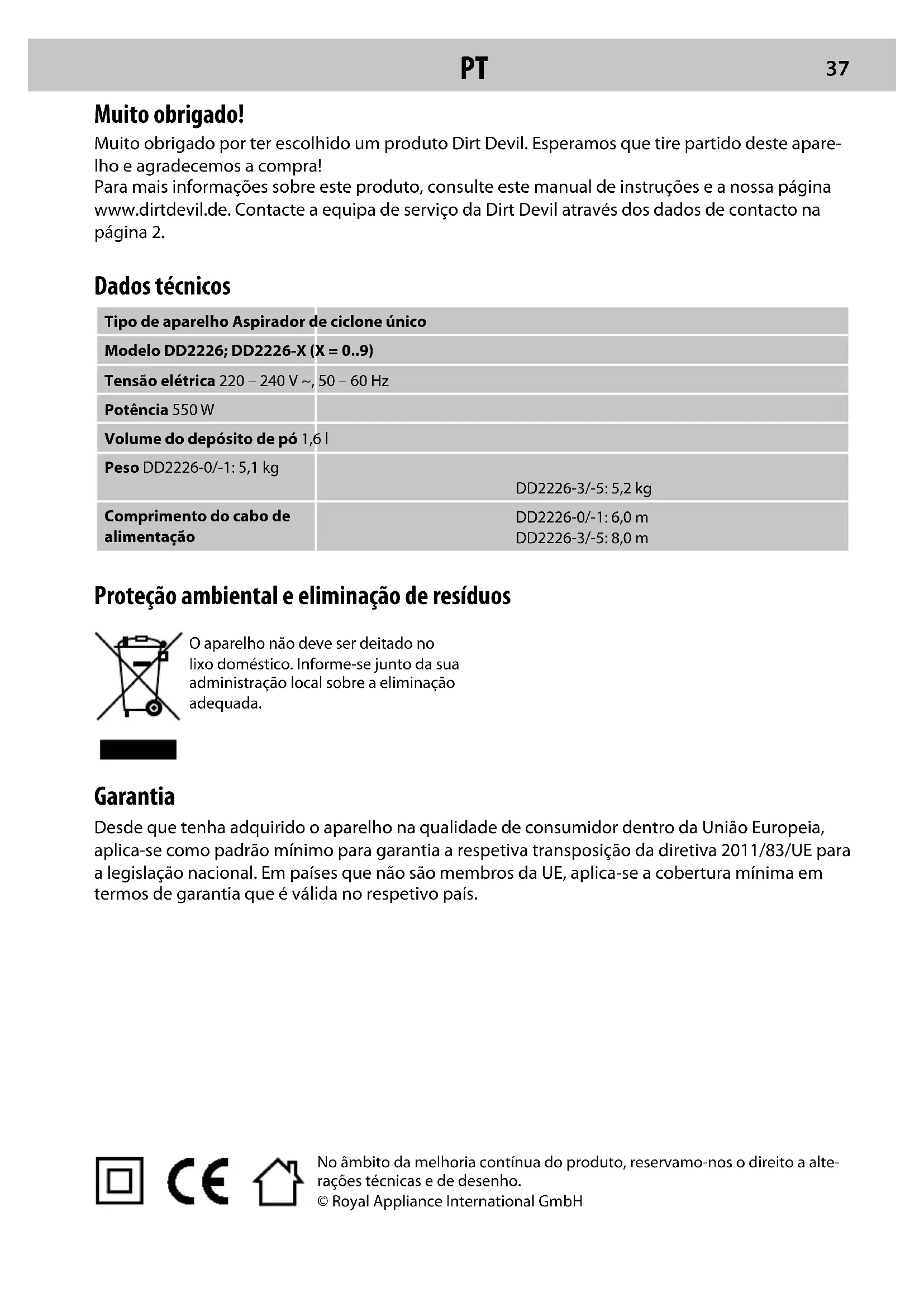 ITNo âmbito da melhoria contínua do produto, reservamo-nos o direito a alte- rações técnicas e de desenho. © Royal Appliance International GmbH Muito obrigado! Muito obrigado por ter escolhido um produto Dirt Devil. Esperamos que tire partido deste apare- lho e agradecemos a compra! Para mais informações sobre este produto, consulte este manual de instruções e a nossa página www.dirtdevil.de. Contacte a equipa de serviço da Dirt Devil através dos dados de contacto na página 2. Dados técnicos Tipo de aparelho Aspirador de ciclone único Modelo DD2226; DD2226-X (X = 0..9) Tensão elétrica 220 – 240 V ~, 50 – 60 Hz Potência 550 W Volume do depósito de pó 1,6 l Peso DD2226-0/-1: 5,1 kg DD2226-3/-5: 5,2 kg Comprimento do cabo de alimentação DD2226-0/-1: 6,0 m DD2226-3/-5: 8,0 m Proteção ambiental e eliminação de resíduos O aparelho não deve ser deitado no lixo doméstico. Informe-se junto da sua administração local sobre a eliminação adequada. Garantia Desde que tenha adquirido o aparelho na qualidade de consumidor dentro da União Europeia, aplica-se como padrão mínimo para garantia a respetiva transposição da diretiva 2011/83/UE para a legislação nacional. Em países que não são membros da UE, aplica-se a cobertura mínima em termos de garantia que é válida no respetivo país.