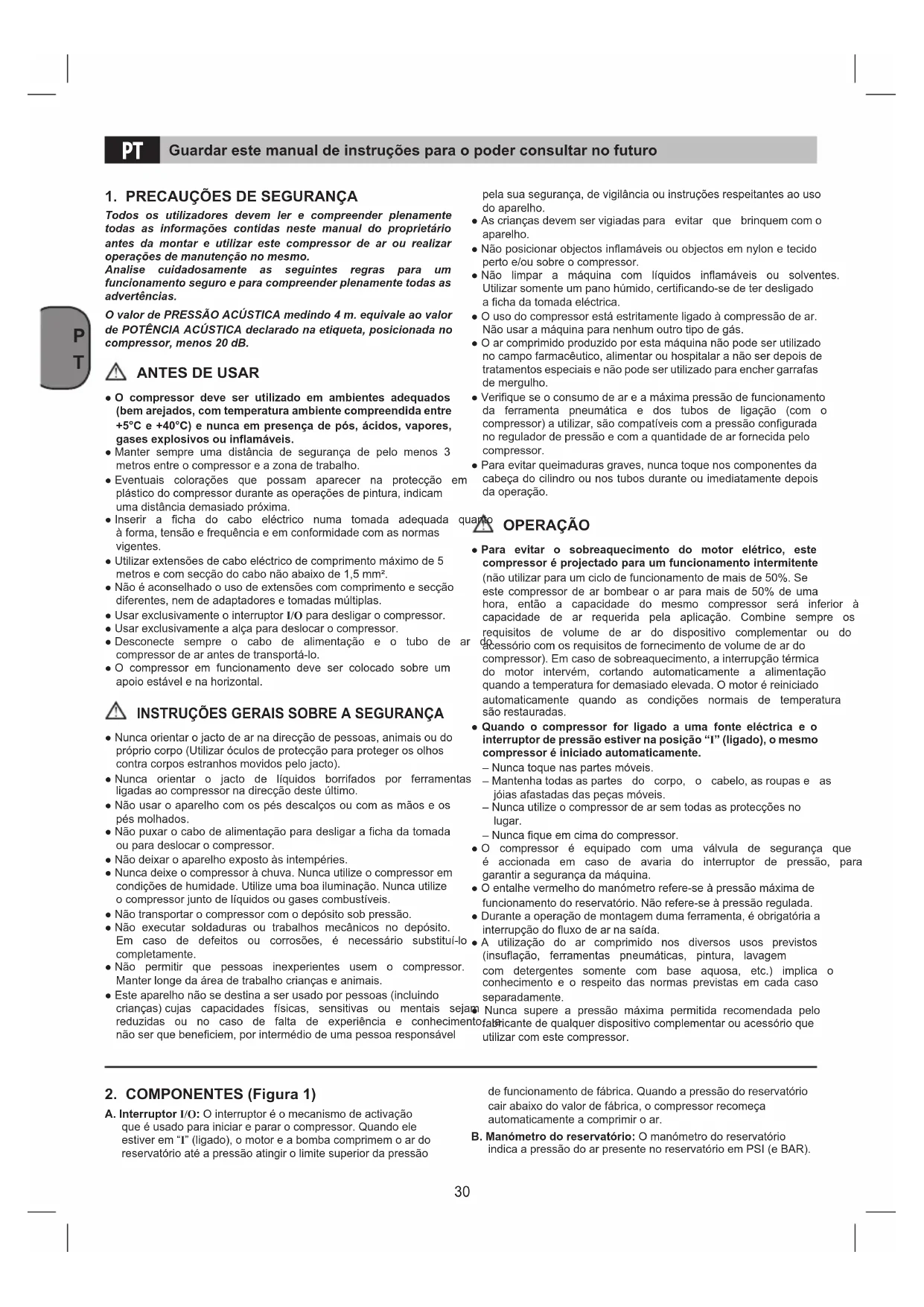 - O compressor é equipado com uma válvula de segurança que é accionada em caso de avaria do interruptor de pressão, para garantir a segurança da máquina.
