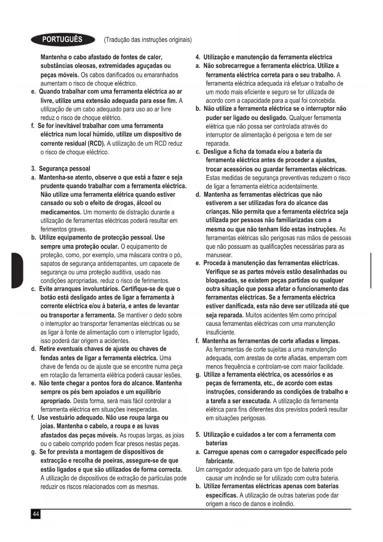 a. As chas da ferramenta eléctrica devem encaixar na tomada. Nunca modique a cha de forma alguma. Não utilize chas adaptadoras com ferramentas eléctricas ligadas à terra. As chas não modicadas e as tomadas compatíveis reduzem o risco de choque eléctrico. b. Evite que o corpo entre em contacto com superfícies ligadas à terra, como tubos, radiadores, fogões e frigorícos. Se o seu corpo estiver “ligado” à terra, o risco de choque elétrico é maior. c. As ferramentas eléctricas não podem ser expostas a chuva nem humidade. A entrada de água numa ferramenta eléctrica aumenta o risco de choque eléctrico. d. Manuseie o cabo com cuidado. Nunca o utilize para transportar, puxar ou desligar a ferramenta eléctrica.44 (Tradução das instruções originais) PORTUGUÊS Mantenha o cabo afastado de fontes de calor, substâncias oleosas, extremidades aguçadas ou peças móveis. Os cabos danicados ou emaranhados aumentam o risco de choque eléctrico. e. Quando trabalhar com uma ferramenta eléctrica ao ar livre, utilize uma extensão adequada para esse m. A utilização de um cabo adequado para uso ao ar livre reduz o risco de choque elétrico. f. Se for inevitável trabalhar com uma ferramenta eléctrica num local húmido, utilize um dispositivo de corrente residual (RCD). A utilização de um RCD reduz o risco de choque eléctrico.