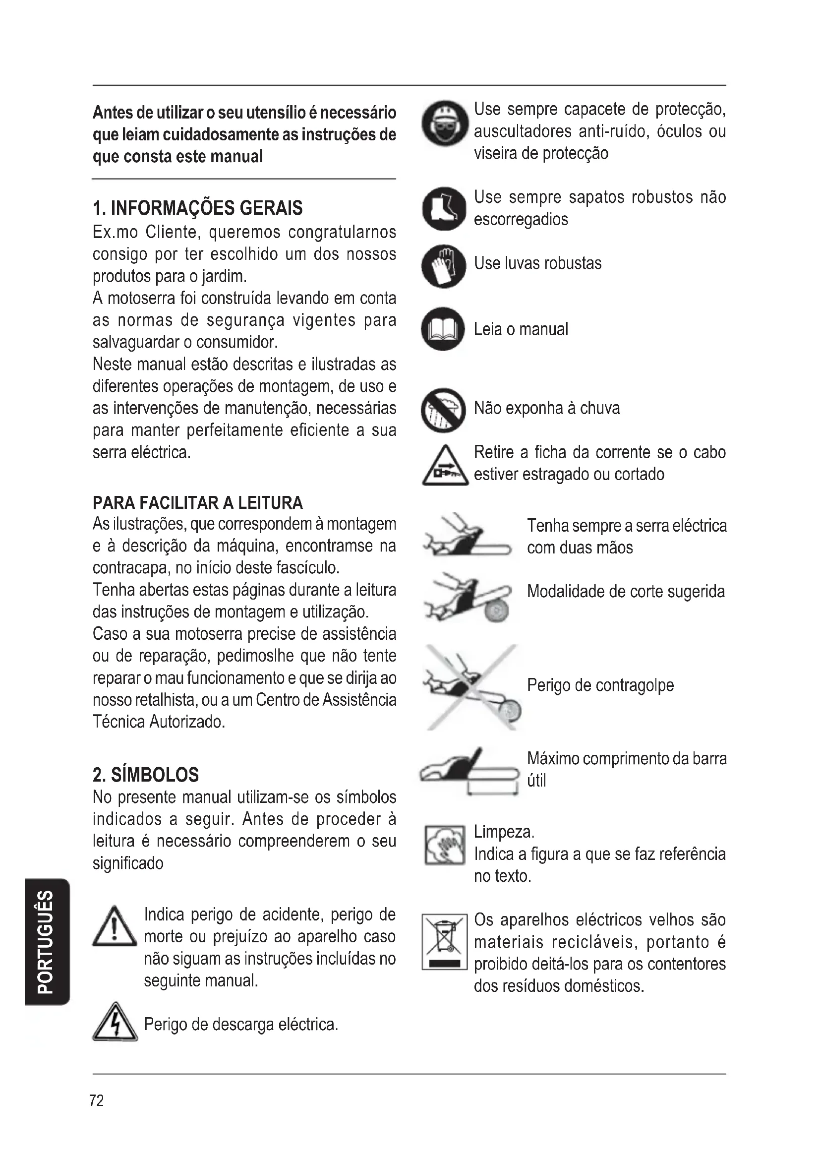 No presente manual utilizam-se os símbolos indicados a seguir. Antes de proceder à leitura é necessário compreenderem o seu significado Indica perigo de acidente, perigo de morte ou prejuízo ao aparelho caso não siguam as instruções incluídas no seguinte manual. Perigo de descarga eléctrica. PORTUGUÊS Use sempre capacete de protecção, auscultadores anti-ruído, óculos ou viseira de protecção Use sempre sapatos robustos não escorregadios Use luvas robustas Leia o manual Não exponha à chuva Retire a ficha da corrente se o cabo estiver estragado ou cortado Tenha sempre a serra eléctrica com duas mãos Modalidade de corte sugerida Perigo de contragolpe Máximo comprimento da barra útil Limpeza. Indica a figura a que se faz referência no texto. Os aparelhos eléctricos velhos são materiais recicláveis, portanto é proibido deitá-los para os contentores dos resíduos domésticos.73 PORTUGUÊS