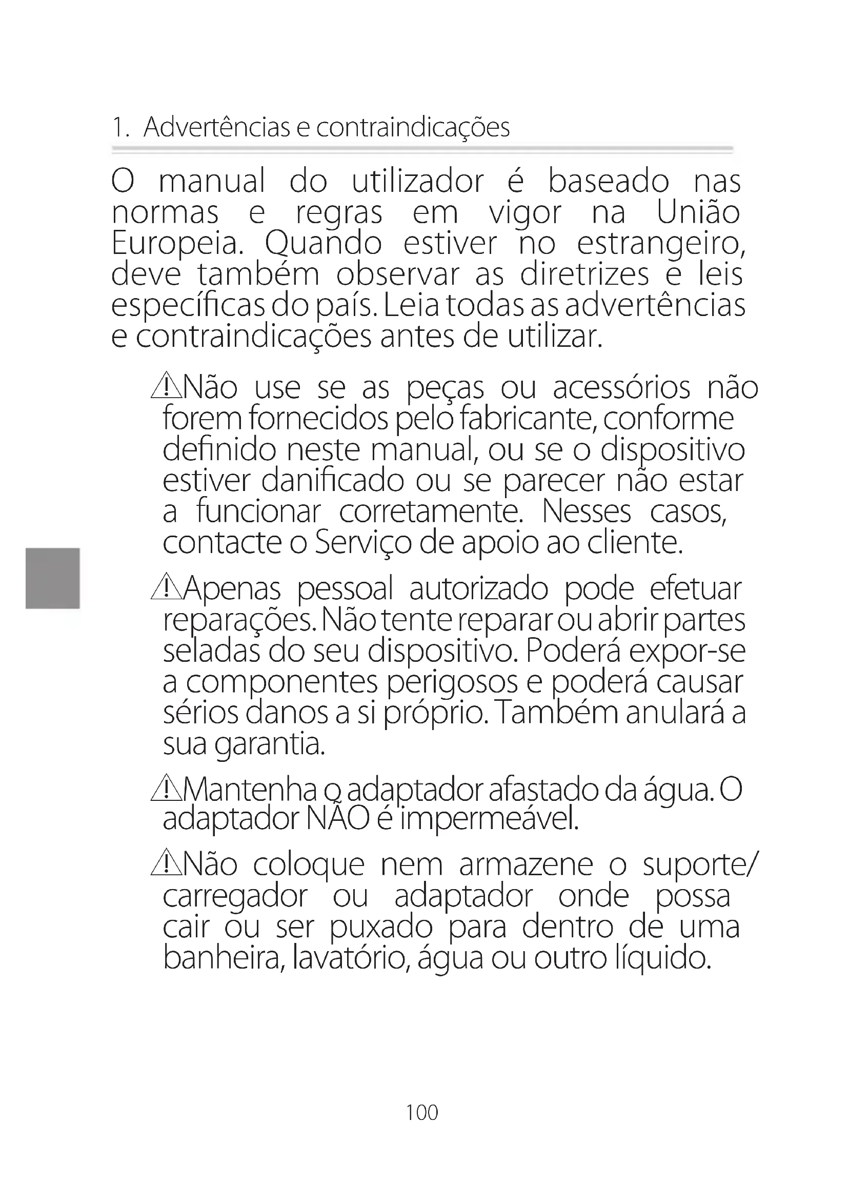 ⚠️Não pegue no suporte/carregador ou adaptador caso tenham caído na água. Desligue imediatamente antes de tentar recuperar algum destes. A incapacidade de desligar o suporte/carregador pode resultar em choque elétrico!