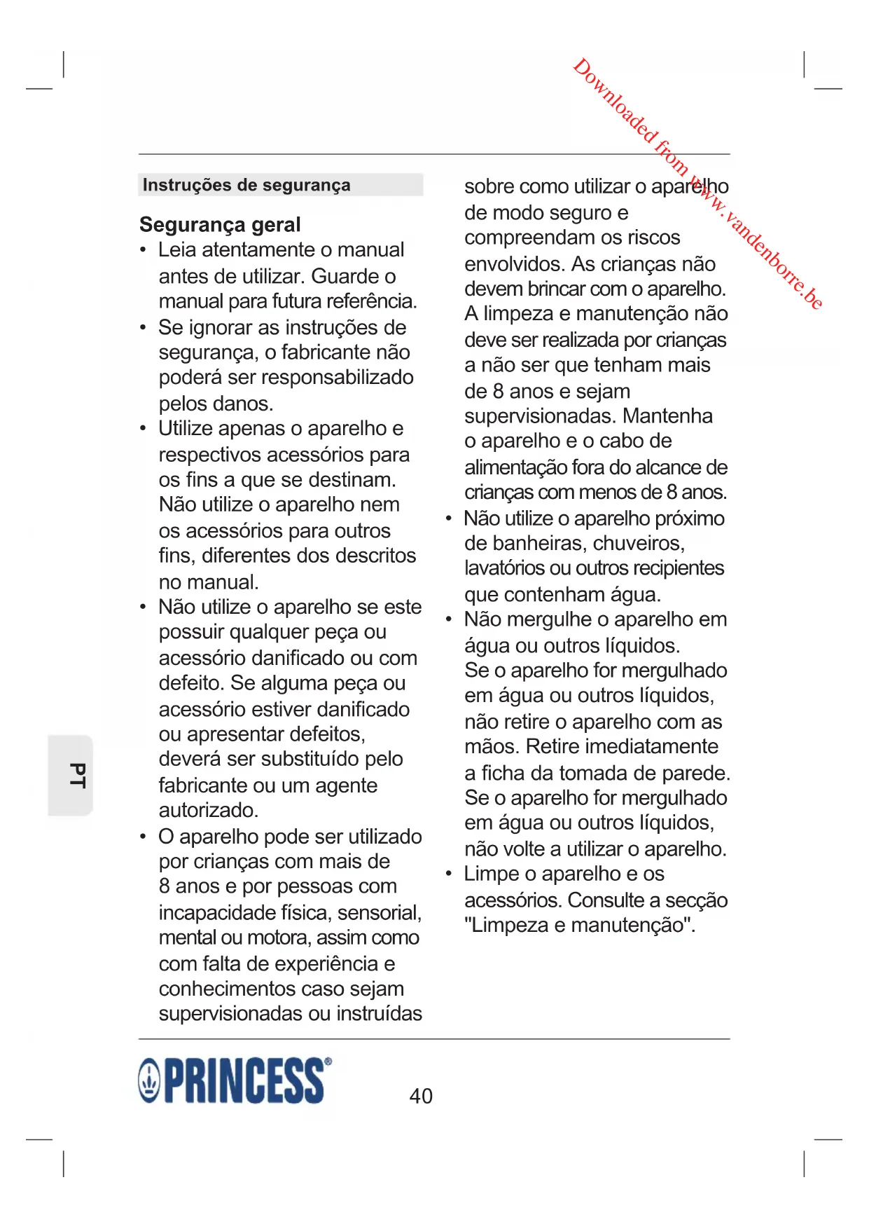 - Quando não eiver a utilizar o aparelho, guarde-o num local seco. Certiquese de que as crianças não têm acesso a aparelhos armazenados. Limpeza e manutenção Advertência! - Antes da limpeza ou manutenção, desligue o aparelho no botão, retire a cha da tomada e aguarde até o aparelho arrefecer. - Não mergulhe o aparelho em água ou outros líquidos. Não mergulhe os acessórios em água ou outros líquidos. Downloaded from www.vandenborre.be43