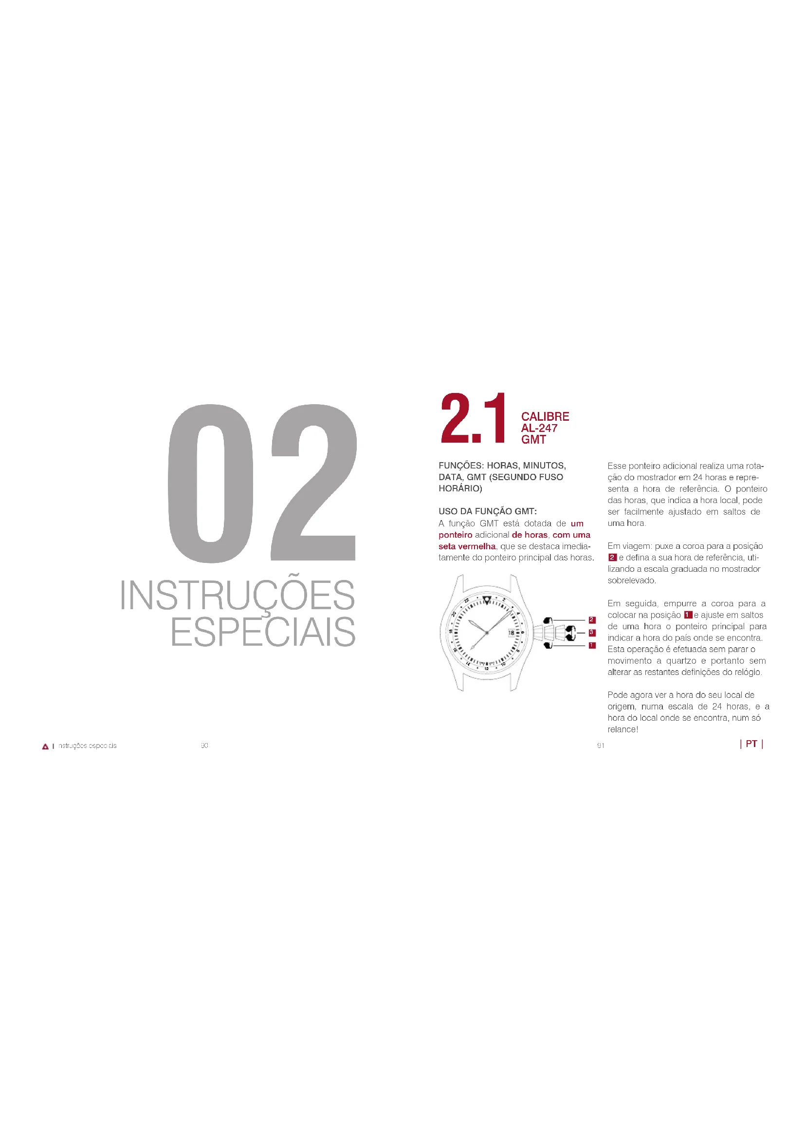 instruções especiais | PT | FUNÇÕES: HORAS, MINUTOS, DATA, GMT (SEGUNDO FUSO HORÁRIO) USO DA FUNÇÃO GMT:A função GMT está dotada de um ponteiro adicional de horas, com uma seta vermelha, que se destaca imedia-tamente do ponteiro principal das horas.Esse ponteiro adicional realiza uma rota-ção do mostrador em 24 horas e repre-senta a hora de referência. O ponteiro das horas, que indica a hora local, pode ser facilmente ajustado em saltos de uma hora. Em viagem: puxe a coroa para a posição