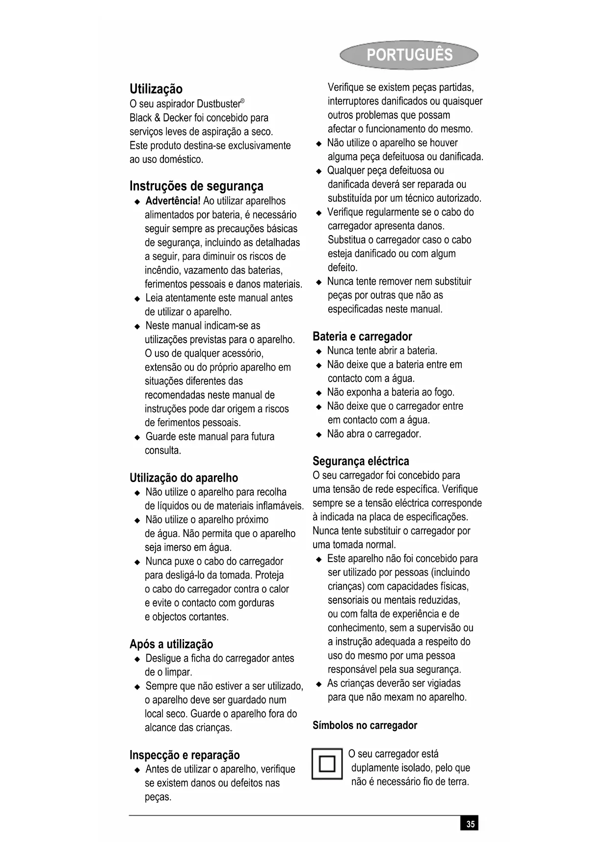 Black & Decker foi concebido para serviços leves de aspiração a seco. Este produto destina-se exclusivamente ao uso doméstico. Instruções de segurança Advertência! Ao utilizar aparelhos alimentados por bateria, é necessário seguir sempre as precauções básicas de segurança, incluindo as detalhadas a seguir, para diminuir os riscos de incêndio, vazamento das baterias, ferimentos pessoais e danos materiais. Leia atentamente este manual antes de utilizar o aparelho. Neste manual indicam-se as utilizações previstas para o aparelho. O uso de qualquer acessório, extensão ou do próprio aparelho em situações diferentes das recomendadas neste manual de instruções pode dar origem a riscos de ferimentos pessoais. Guarde este manual para futura consulta. Utilização do aparelho Não utilize o aparelho para recolha de líquidos ou de materiais inflamáveis. Não utilize o aparelho próximo de água. Não permita que o aparelho seja imerso em água. Nunca puxe o cabo do carregador para desligá-lo da tomada. Proteja o cabo do carregador contra o calor e evite o contacto com gorduras e objectos cortantes. Após a utilização Desligue a ficha do carregador antes de o limpar. Sempre que não estiver a ser utilizado, o aparelho deve ser guardado num local seco. Guarde o aparelho fora do alcance das crianças. Inspecção e reparação Antes de utilizar o aparelho, verifique se existem danos ou defeitos nas peças. Verifique se existem peças partidas, interruptores danificados ou quaisquer outros problemas que possam afectar o funcionamento do mesmo. Não utilize o aparelho se houver alguma peça defeituosa ou danificada. Qualquer peça defeituosa ou danificada deverá ser reparada ou substituída por um técnico autorizado. Verifique regularmente se o cabo do carregador apresenta danos. Substitua o carregador caso o cabo esteja danificado ou com algum defeito. Nunca tente remover nem substituir peças por outras que não as especificadas neste manual. Bateria e carregador Nunca tente abrir a bateria. Não deixe que a bateria entre em contacto com a água. Não exponha a bateria ao fogo. Não deixe que o carregador entre em contacto com a água. Não abra o carregador. Segurança eléctrica O seu carregador foi concebido para uma tensão de rede específica. Verifique sempre se a tensão eléctrica corresponde à indicada na placa de especificações. Nunca tente substituir o carregador por uma tomada normal. Este aparelho não foi concebido para ser utilizado por pessoas (incluindo crianças) com capacidades físicas, sensoriais ou mentais reduzidas, ou com falta de experiência e de conhecimento, sem a supervisão ou a instrução adequada a respeito do uso do mesmo por uma pessoa responsável pela sua segurança. As crianças deverão ser vigiadas para que não mexam no aparelho. Símbolos no carregador O seu carregador está duplamente isolado, pelo que não é necessário fio de terra.36 PORTUGUÊS Transformador isolado contra falhas. A fonte de alimentação está electricamente separada da saída do transformador. O carregador desliga-se automaticamente caso a temperatura ambiente fique demasiado elevada. Em consequência, o carregador fica inoperacional. A unidade deve ser desligada da fonte de alimentação de rede e levada para ser reparada num centro de reparação autorizado. O carregador destina-se apenas a ser utilizado no interior. Leia atentamente o manual antes de utilizar o aparelho. Advertência! Mantenha os aparelhos eléctricos fora do alcance das crianças ou pessoas enfermas. Não deixe que estes utilizem os aparelhos sem supervisão. Características