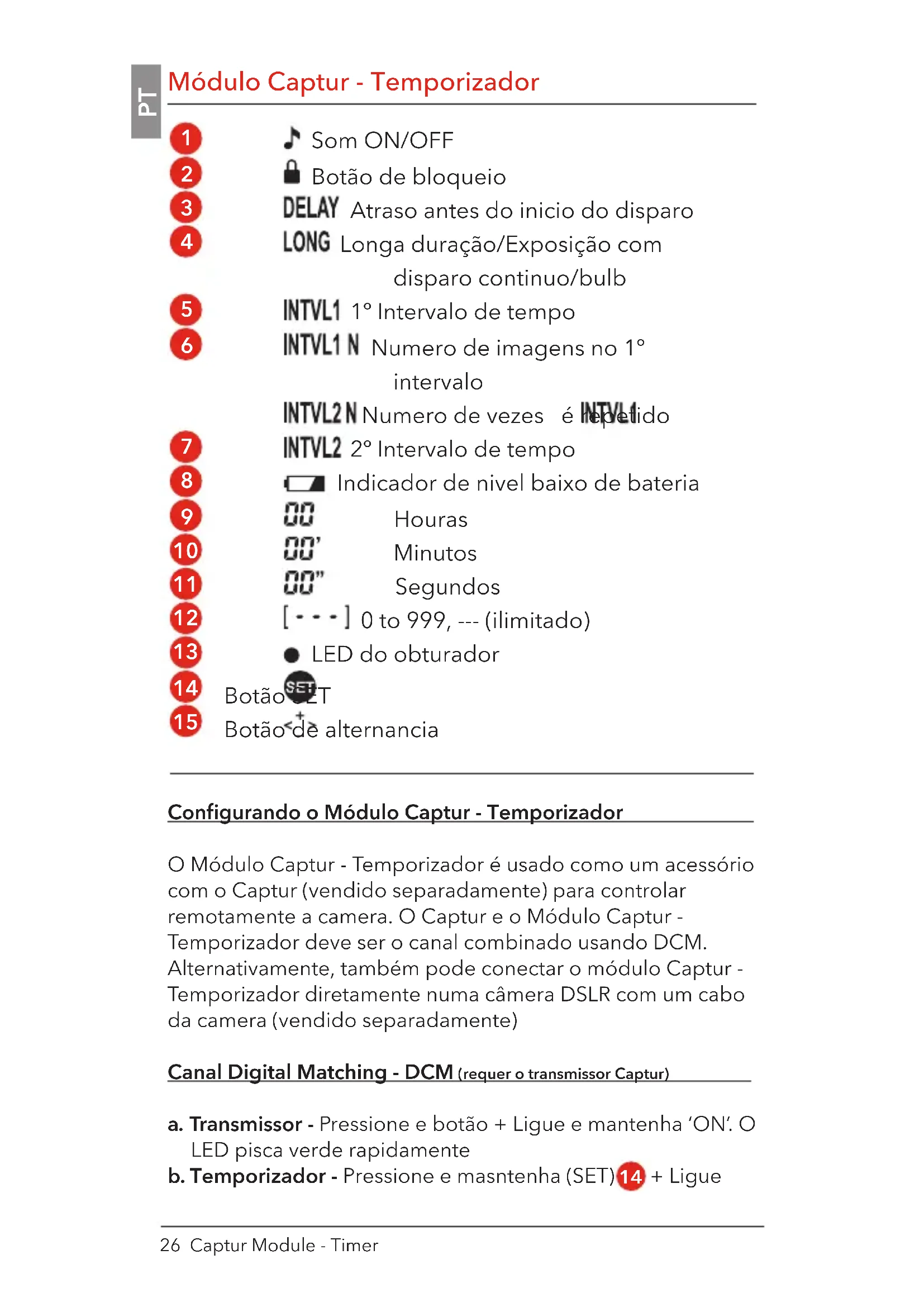 O Módulo Captur - Temporizador é usado como um acessório com o Captur (vendido separadamente) para controlar remotamente a camera. O Captur e o Módulo Captur - Temporizador deve ser o canal combinado usando DCM. Alternativamente, também pode conectar o módulo Captur - Temporizador diretamente numa câmera DSLR com um cabo da camera (vendido separadamente)