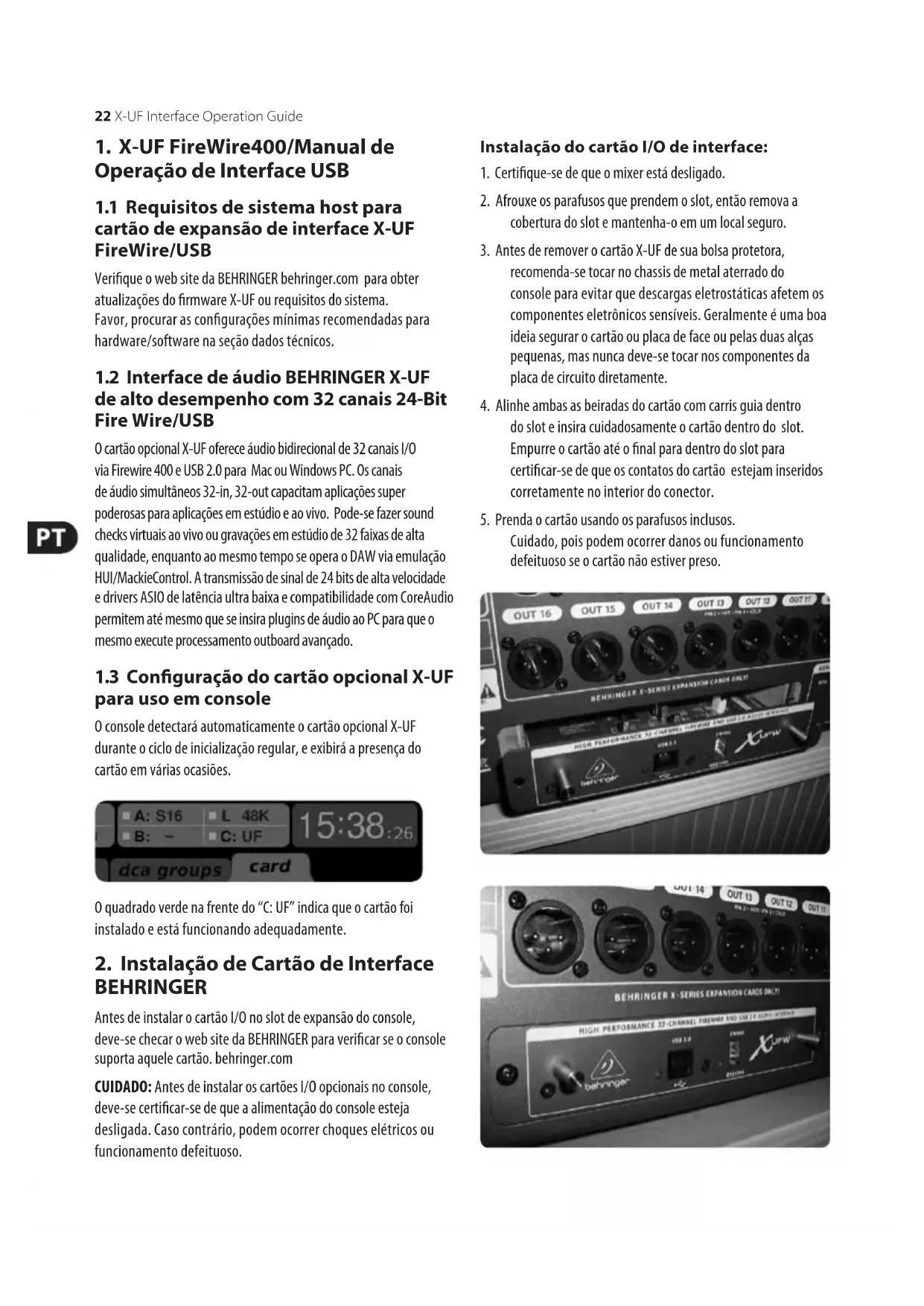 Cuidado, pois podem ocorrer danos ou funcionamento defeituoso se o cartão não estiver preso. 22 X-UF Interface Operation Guide3. Conguração do PC para fazer Interface com o Cartão Opcional X-UF Favor, referir-se ao web site behringer.com para obter mais conselhos sobre a conguração do cartão de interface do X-UF. Windows: Há um driver ASIO de alto desempenho disponível para download, que é essencial para áudio de baixa latência em computadores Windows computers. Mac OS: O X-UF é compatível com CoreAudio e portanto, funciona com baixa latência em computadores Mac sem nenhuma instalação de driver adicional. Windows ASIO Driver Faça o download dos arquivos do instalador de driver X32 ASIO a partir do web site behringer.com. Há um arquivo zip para USB e um para instalação de driver FireWire. Desempacote aquele que pretende usar, ou ambos, no seu hard drive local. Dê um clique duplo em Setup.exe na pasta desempacotada correspondente e siga as instruções que aparecem na tela. Painéis de Controle do Driver Quando o driver estiver instalado, pode-se abrir o painel de controle ao se clicar duas vezes no pequeno ícone de bandeja. Essas telas o permitirão congurar o cartão de expansão X-UF no X32 como uma interface de áudio para o seu computador. Faça o download do manual completo do X32 a partir do web site behringer.com e leia o capítulo ’X-UF Operation Guide’ (Manual de Operação do X-UF) para obter mais detalhes. Aviso O não cumprimento dos seguintes avisos pode levar a fatalidades ou ferimentos sérios causados por fogo ou choque elétrico. Antes de instalar o cartão, deve-se consultar o manual do proprietário do dispositivo host ou o web site behringer.com para vericar se o seu dispositivo host comporta este cartão, e para vericar o número de cartões que podem ser instalados em combinação com outro BEHRINGER ou outros cartões de terceiros.