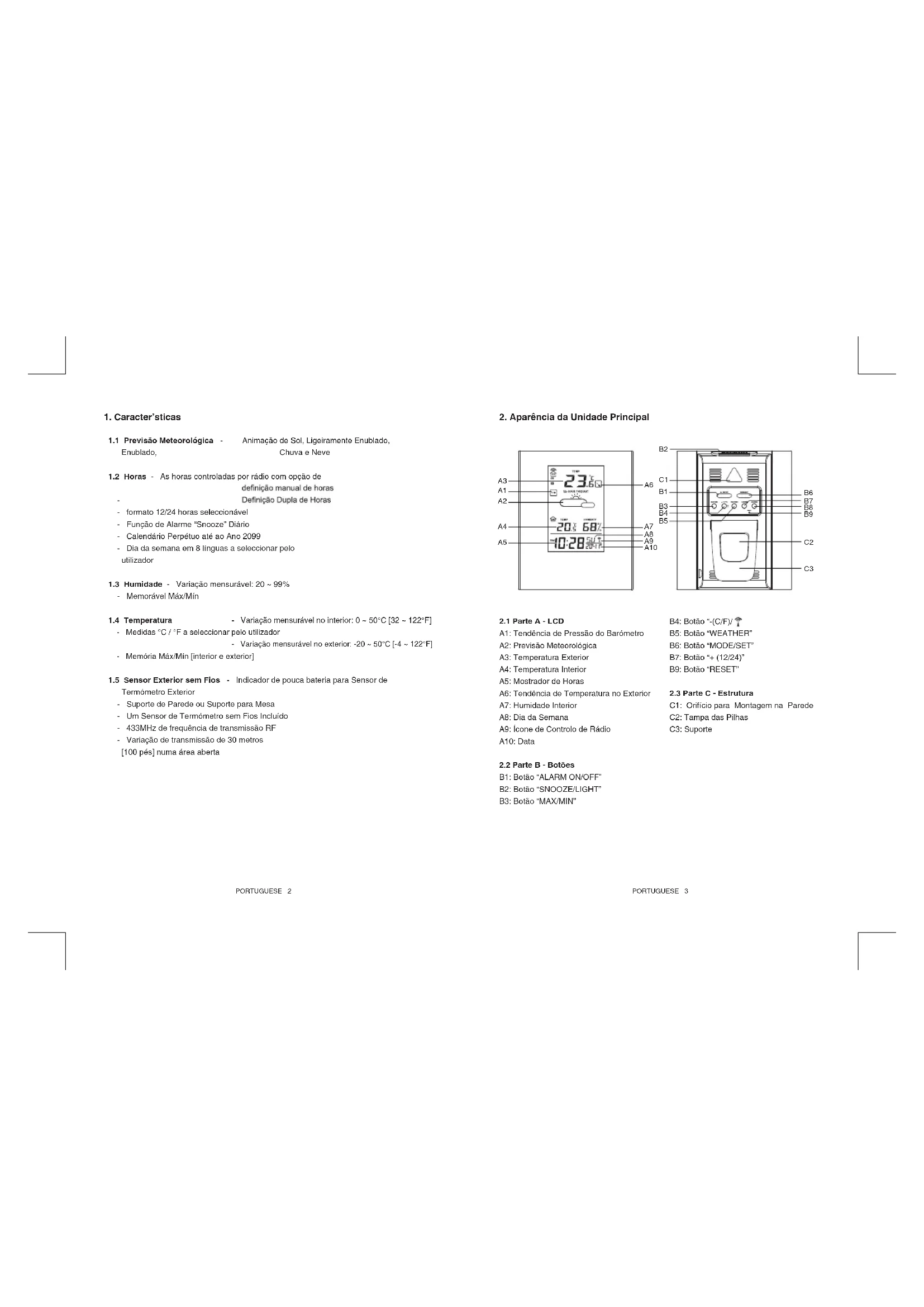 - Depoto de insertar as pilhas, ou manter o botao "WEATHER" (B5) pressionado durante 3 segudos, oicone do tempo pisa (A2) no LCD. Insira o tempo actual pressionando o botao "(B4) ou "+" (B7). Pressione o botao "WEATHER" (B5) para confirmar a definicao. A previsao meteorologica podera nao ser exacta se o tempo actual inserinho não eslimvar correto.