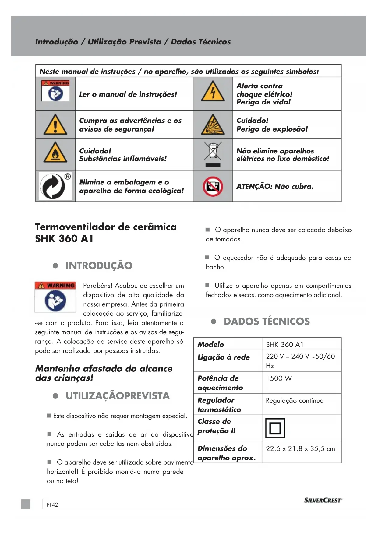 Potência de aquecimento 1500 W Regulador termostático Regulação contínua Classe de proteção II Dimensões do aparelho aprox. 22,6 x 21,8 x 35,5 cm Introdução / Utilização Prevista / Dados Técnicos Neste manual de instruções / no aparelho, são utilizados os seguintes símbolos: Ler o manual de instruções! Alerta contra choque elétrico! Perigo de vida! Cumpra as advertências e os avisos de segurança! Cuidado! Perigo de explosão! Cuidado! Substâncias inflamáveis! Não elimine aparelhos elétricos no lixo doméstico! Elimine a embalagem e o aparelho de forma ecológica! ATENÇÃO: Não cubra.PT 43 Índice