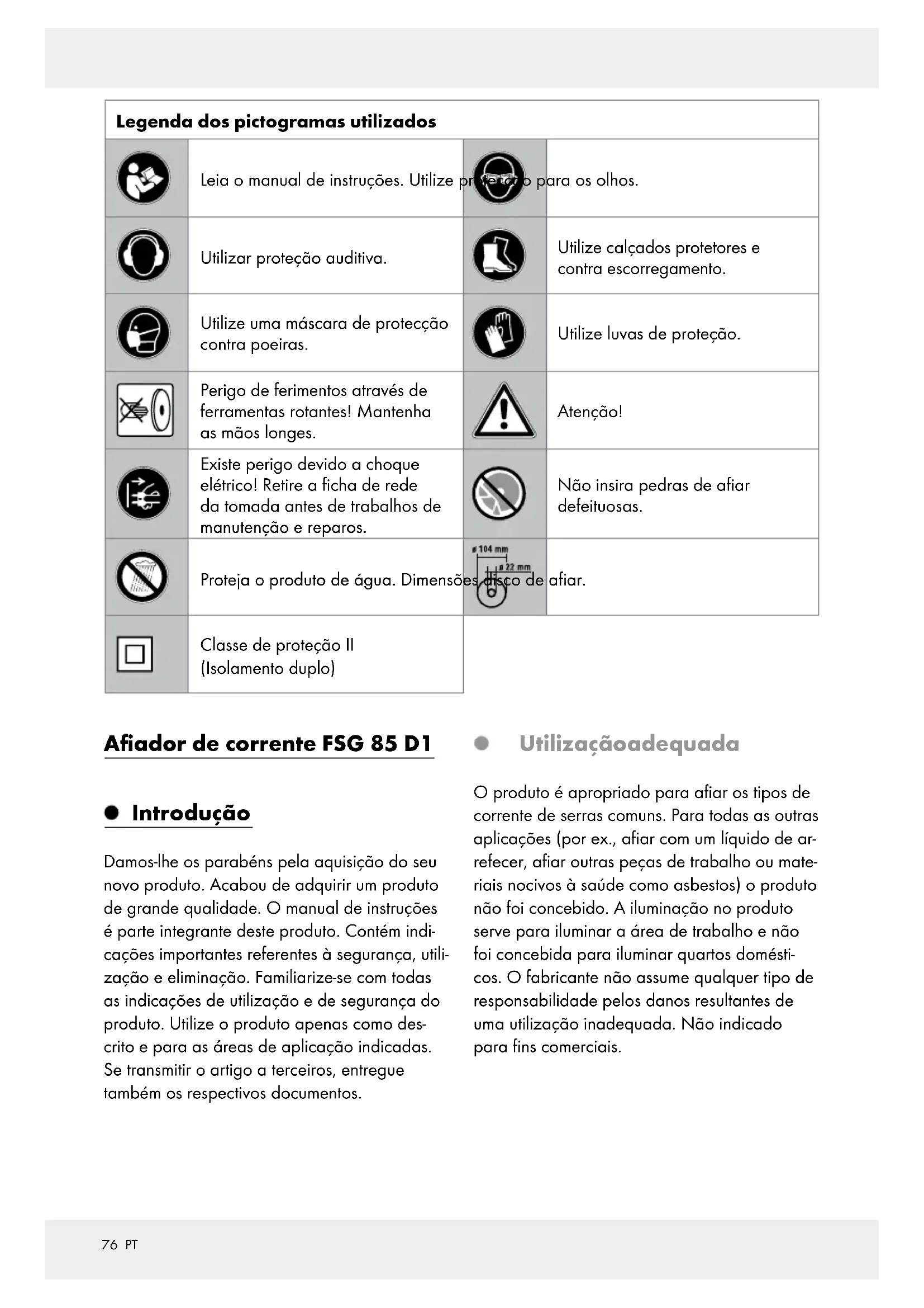 concertada por uma pessoa espe- cializada Esta ferramenta elétrica corresponde as especificações de segurança. Reparos somente podem ser feitos por pessoas especializadas usando peças originais, caso contrário podem ser criados acidentes para o usuário. Os seguintes riscos residuais permanecem ape- sar das medidas do design especialmente se- guro e medidas de segurança adicionais; O disco de afiar ainda anda após a ferramenta ser desligada. Existe perigo de ferimentos. Avisos de segurança adicionais Somente conecte este produto em uma to- mada com dispositivo de proteção de erro de eletricidade (Interruptor FI) com uma80 PT medição de erro de eletricidade de não mais de 30 mA. Mantenha cabos de rede e prolongamento longe do disco de afiar e corrente de ser- rar. No caso de danos ou cortes, retire a ficha de rede da tomada. Não toque no cabo, antes de separar da rede. Existe perigo devido a choque elétrico! Verifique visualmente as pedras de afiar antes da utilização. Não utilize pedras de afiar com rasgos, quebras ou outros danos. Troque um disco de afiar desgastado. Jamais opere o produto sem disco de prote- ção de visão. Não trabalhe com o produto se estiver cansado ou após ingerir álcool ou pílulas. Sempre faça uma pasa de trabalho quando necessário. Não utilize o produto em atmosferas explo- sivas ou onde possa causar faíscas, fogo, explosões etc. Caso não seja seguido, existe o perigo de fogo ou explosão. Certifique-se de que ao trabalhar com poeira as aberturas de ventilação estejam livres. Mantenha as suas mãos longe do disco de afiar e dentes da corrente de serra quando estiver operando o produto. Não movi- mente a corrente de serra com as mãos. Existe perigo de ferimentos. Jamais segure os dedos entre disco de afiar e prato giratório ou entre disco de afiar e disco de proteção. Existe perigo de esma- gamento. A corrente de serra fica quente ao afiar. Não toque no local trabalhado, existe perigo de queimadura. Utilize somente discos de afiar do fabri- cante. Não utilize lâminas de serra. Desligue o produto e puxe a ficha de rede - para soltar uma ferramenta de aplicação bloqueada, - caso o cabo de rede esteja danificado ou enrolado, - na caso de barulhos estranhos. Antes da utilização Aviso: Remova completamente o material da embalagem. O utilizador deve estar próximo ao produto para não criar uma extensão desnecessá- ria do corpo ou uma posição insegura. Montagem Aviso: Sempre fixe o produto com os parafu- sos fornecidos (M10 x 60). Esteja atento para que tenhas suficiente- mente espaço e outras pessoas não este- jam em perigo. Fixe o produto sempre através de parafusos com comprimento e espessura suficiente na superfície de trabalho para não perder o controle sobre o produto. Montar o produto (veja Fig. B) - Espessura do canto da mesa a ser trabalhado: 15–30 mm - Espessura da broca: 10,5 mm - Tamanho do parafuso: M10 Posicione o produto com ajuda do entalhe de limitação