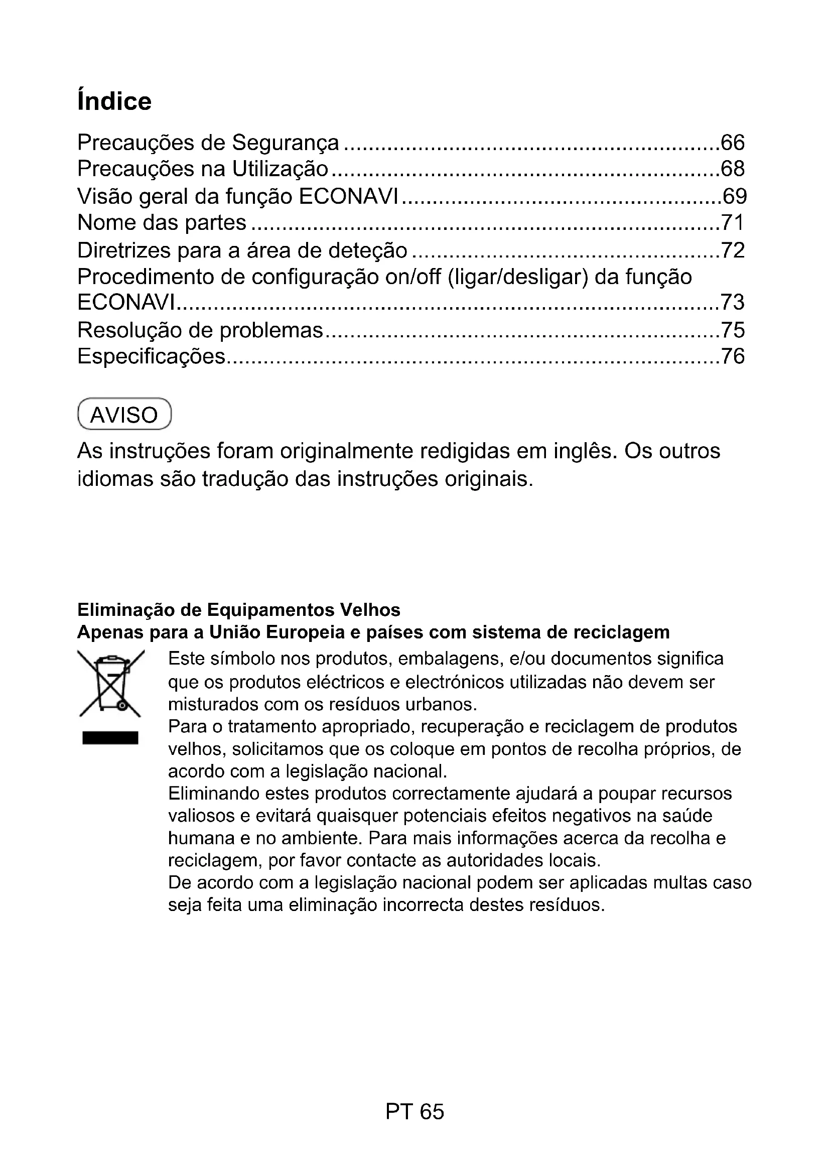 - Solo uso interno. Alimentazione DC16 V (Fornito dall'unità interna) Collegamenti 1 sensore per gruppo interno ACXF55-00551.indb 64 2021/10/07 9:52:41PT 65 Índice Precauções de Segurança .............................................................66 Precauções na Utilização ...............................................................68 Visão geral da função ECONAVI ....................................................69 Nome das partes ............................................................................71 Diretrizes para a área de deteção ..................................................72 Procedimento de conguração on/off (ligar/desligar) da função ECONAVI ........................................................................................73 Resolução de problemas ................................................................75 Especicações................................................................................76 AVISO As instruções foram originalmente redigidas em inglês. Os outros idiomas são tradução das instruções originais. Eliminação de Equipamentos Velhos Apenas para a União Europeia e países com sistema de reciclagem Este símbolo nos produtos, embalagens, e/ou documentos signica que os produtos eléctricos e electrónicos utilizadas não devem ser misturados com os resíduos urbanos. Para o tratamento apropriado, recuperação e reciclagem de produtos velhos, solicitamos que os coloque em pontos de recolha próprios, de acordo com a legislação nacional. Eliminando estes produtos correctamente ajudará a poupar recursos valiosos e evitará quaisquer potenciais efeitos negativos na saúde humana e no ambiente. Para mais informações acerca da recolha e reciclagem, por favor contacte as autoridades locais. De acordo com a legislação nacional podem ser aplicadas multas caso seja feita uma eliminação incorrecta destes resíduos. ACXF55-00551.indb 65 2021/10/07 9:52:41PT 66